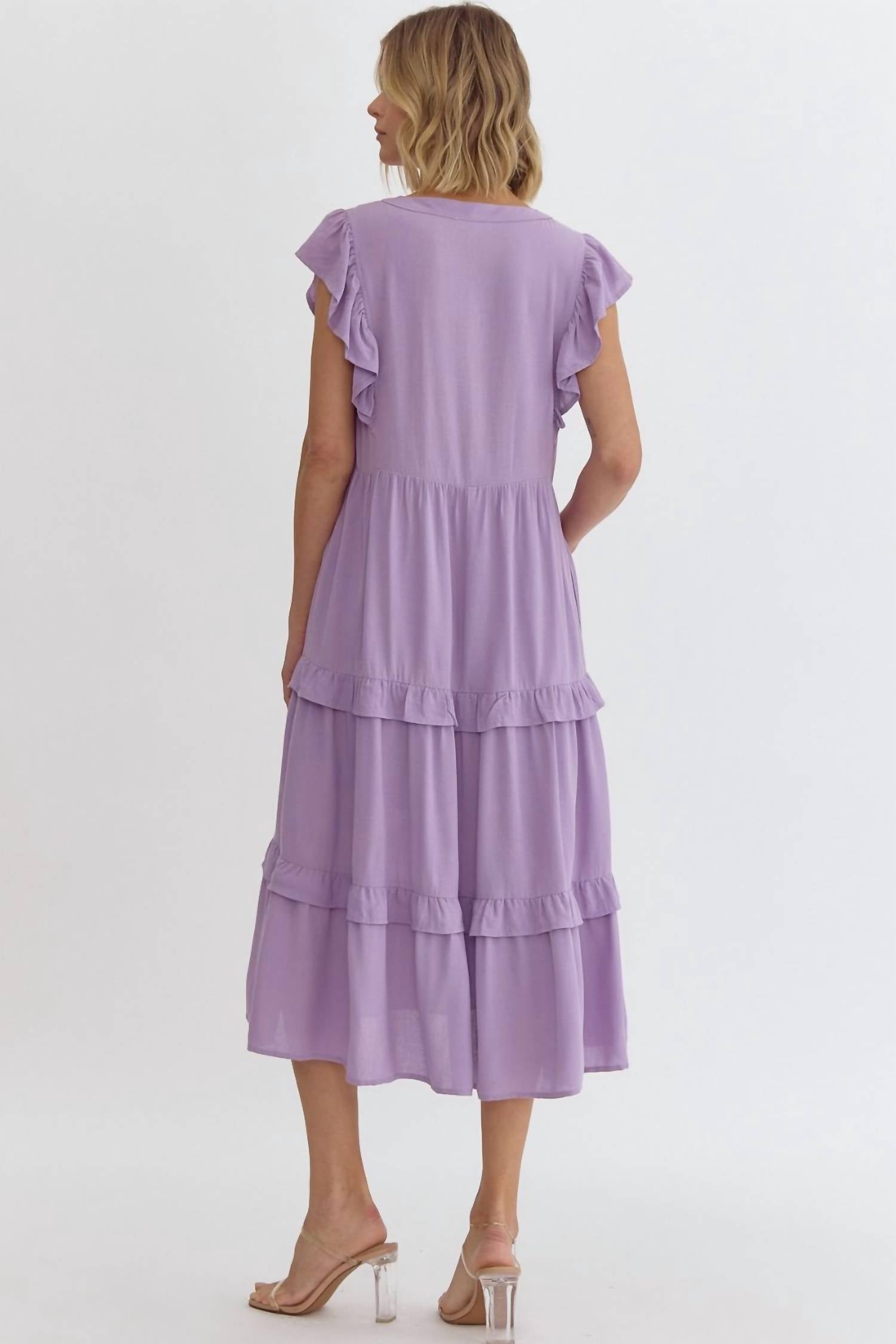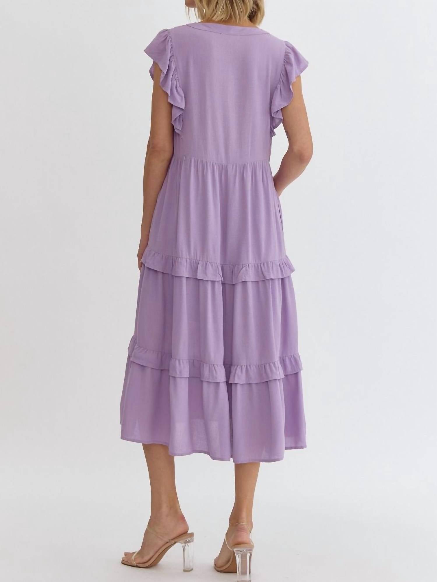 A midi dress so versatile, your options for wearing it are endless. Discover the Women's Keep My Secret Dress by Entro, an exquisite lavender midi dress designed to blend fashion and function seamlessly. This sleeveless dress features a V-neck, ruffle sleeves, and a tiered A-line silhouette, crafted from 100% lightweight, non-sheer Rayon for ultimate comfort and style. With convenient side pockets and its solid pattern, it's perfect for any occasion. Enjoy effortless style with this chic piece in your wardrobe.