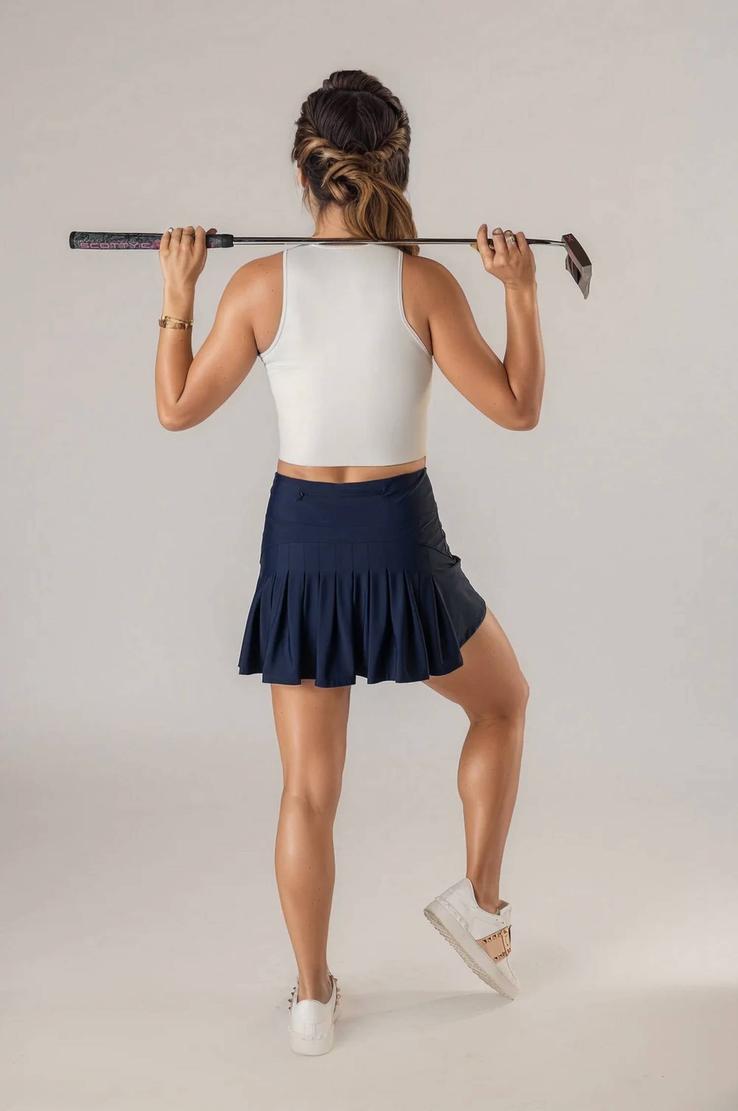 The go-anywhere and do-anything skort that you'll love to live in. Enhance your athletic endeavors featuring flattering and flirty back pleats. With a comfortable mid-rise fit, offers practical side pockets in the built-in shorts and a hidden pocket at the back waist, while the signature rose gold lip pin adds a touch of elegance. Made in US with Italian fabric. Consists of 78% recycled polyester and 22% elastane, allowing for ease of movement. Pull on style. Machine wash warm, lay flat to dry. Ideal for summer athleisure and perfect for sports like golf, pickleball, and tennis.