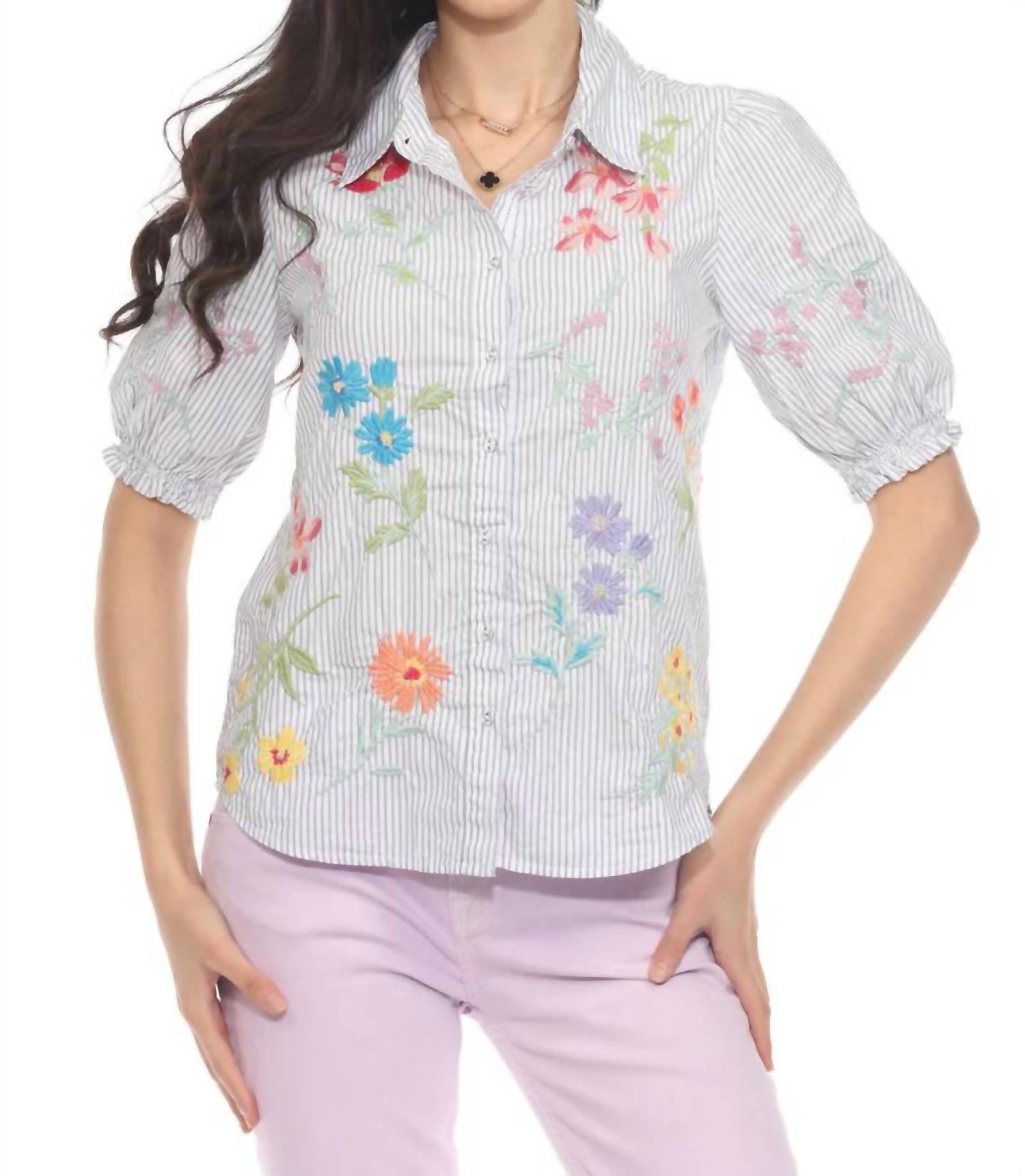 A timeless blouse that will never go out of style. Black& white stripe blouse with multi colored floral embroidery-collared- button front-puff shirt sleeves