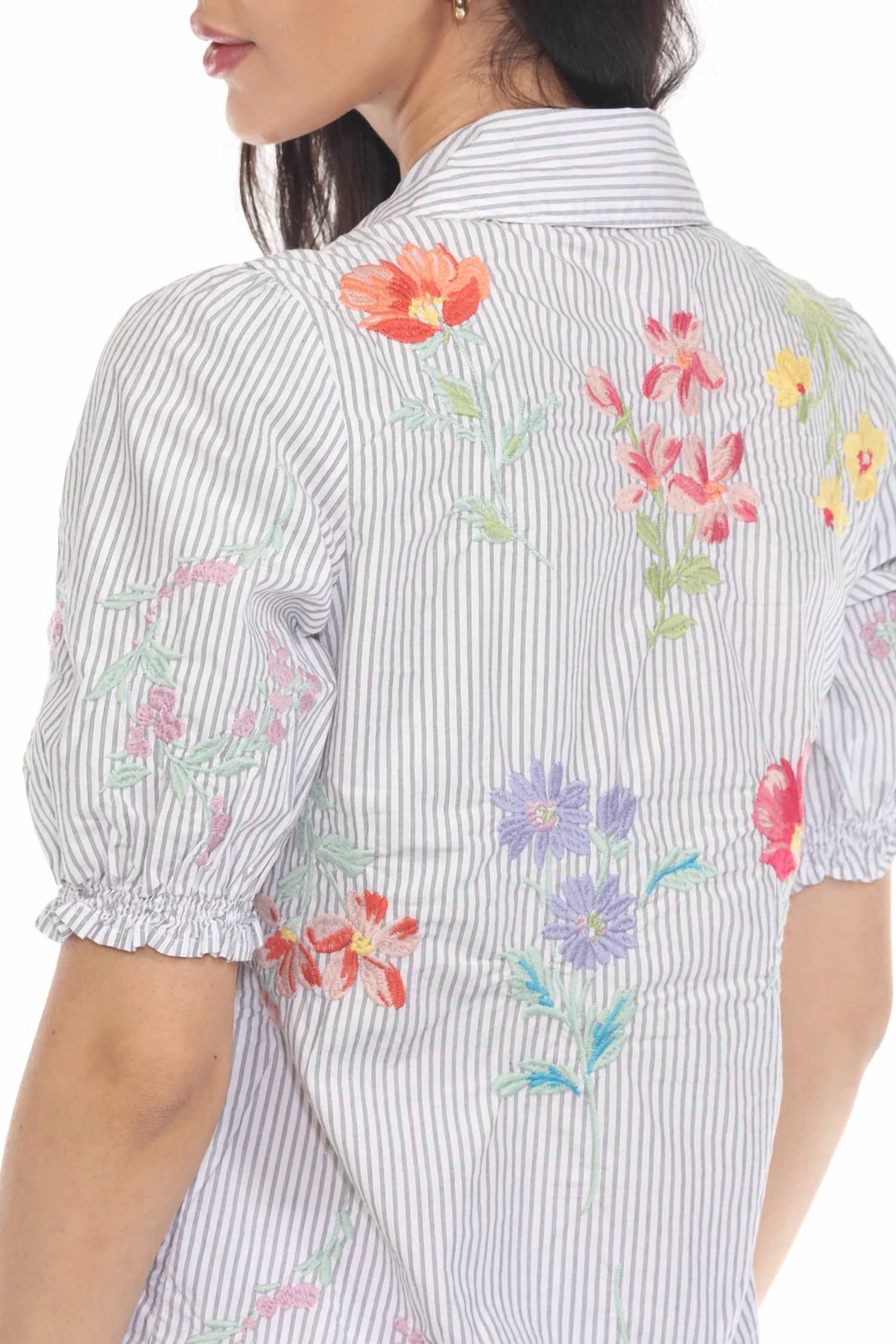 Black& white stripe blouse with multi colored floral embroidery-collared- button front-puff shirt sleeves