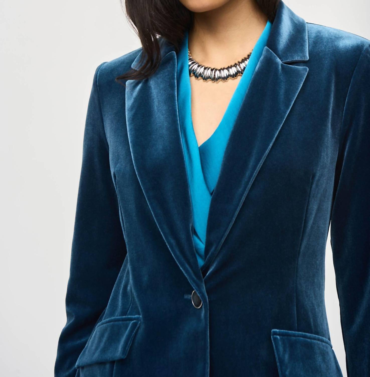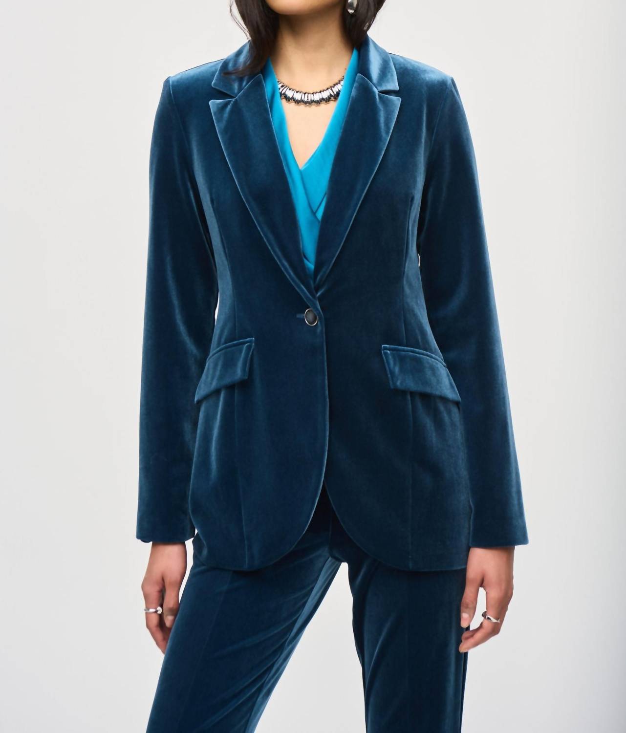Elevate your look with the Joseph Ribkoff Long Sleeve Velvet Blazer in the captivating shade of Nightfall. This blazer boasts long sleeves and a luxurious composition of 98% Polyester and 2% Spandex. Made in Canada, it features a flattering hip-length cut with a refined notch collar and a single-button closure complemented by flap pockets. For optimal care, hand wash in cold water, hang to dry in the shade, and avoid ironing or dry cleaning to maintain its pristine velvet finish.