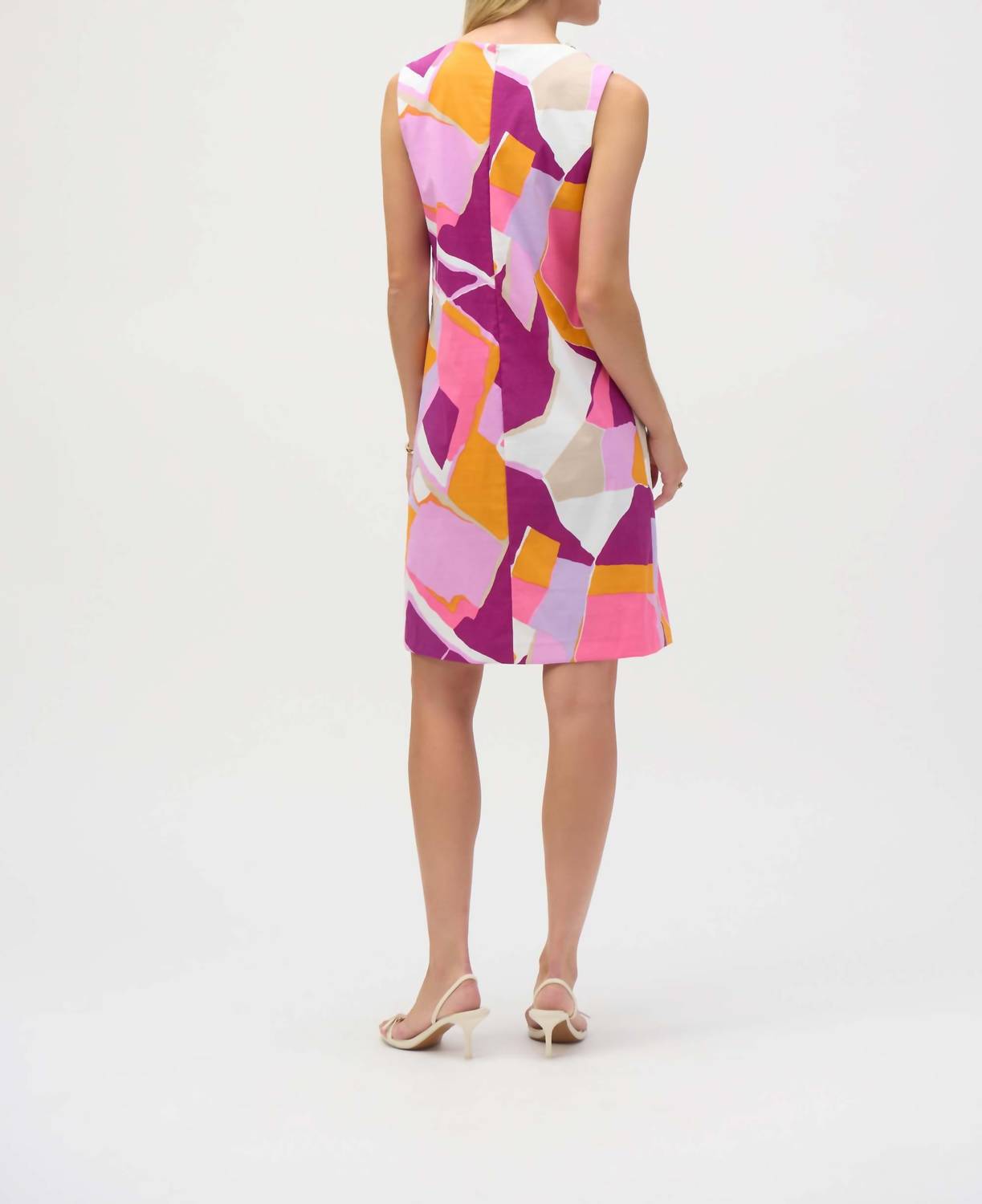 The kind of easy and flattering dress you'll be reaching for all season long. Discover the allure of Joseph Ribkoff's sleeveless mini shift dress, perfect for casual summer occasions. This abstract-patterned piece features a round-neck design and jewel embellishments, adding a touch of sophistication. Embrace a feminine style with this versatile dress that seamlessly blends comfort and elegance. Ideal for any wardrobe, this dress is your go-to for effortless chic.