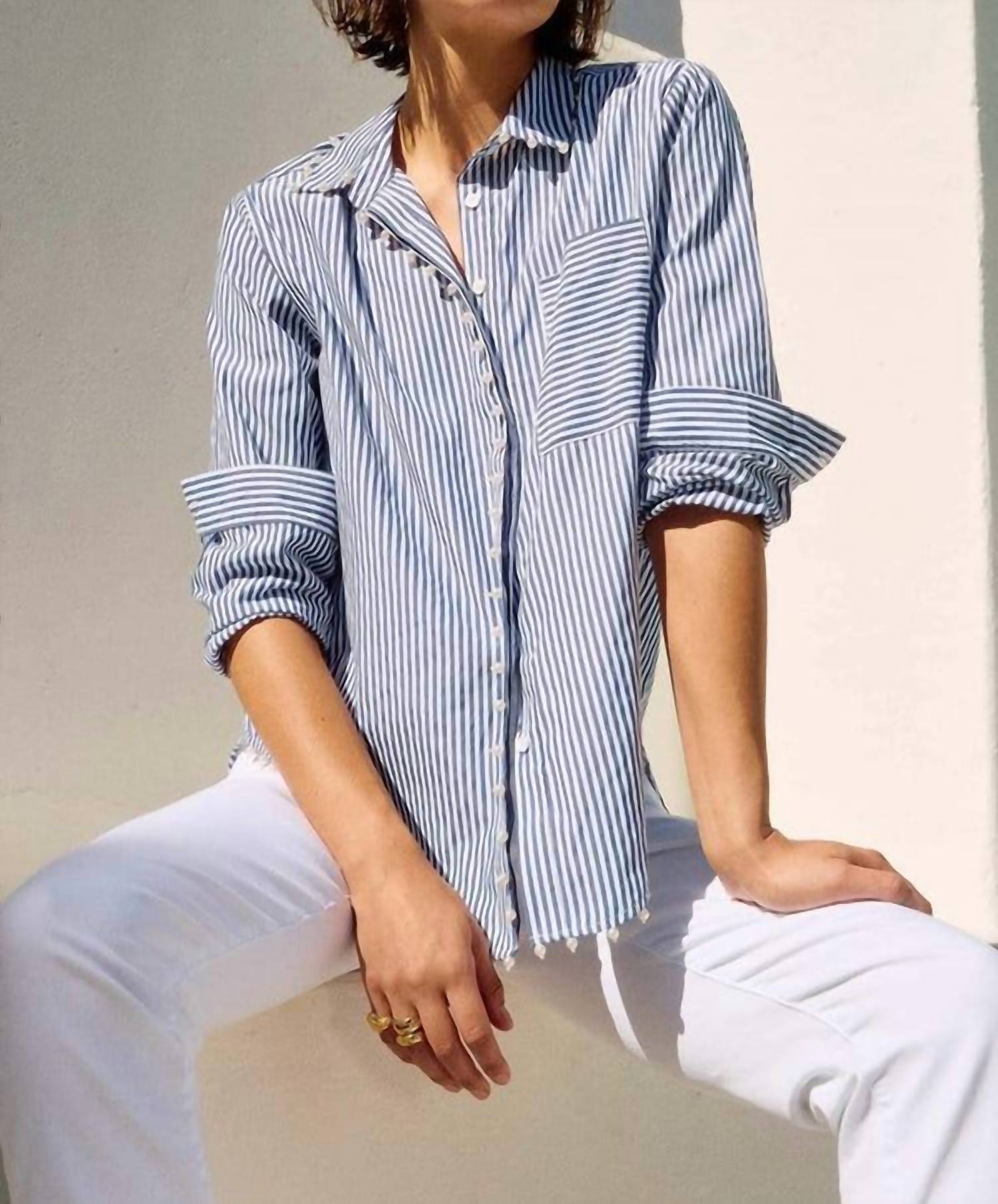 A classic button down shirt that will never go out of style. Discover the Striped Blouse With Pearl Details by Joseph Ribkoff, a sophisticated addition to your wardrobe in a striking blue and white striped pattern. This blouse features long sleeves and a collar neckline, with a button closure adorned by delicate pearl trim. Crafted from 68% Polyester and 32% Cotton, it includes a practical chest pocket for added flair. For best results, hand wash in cold water to maintain its elegance.