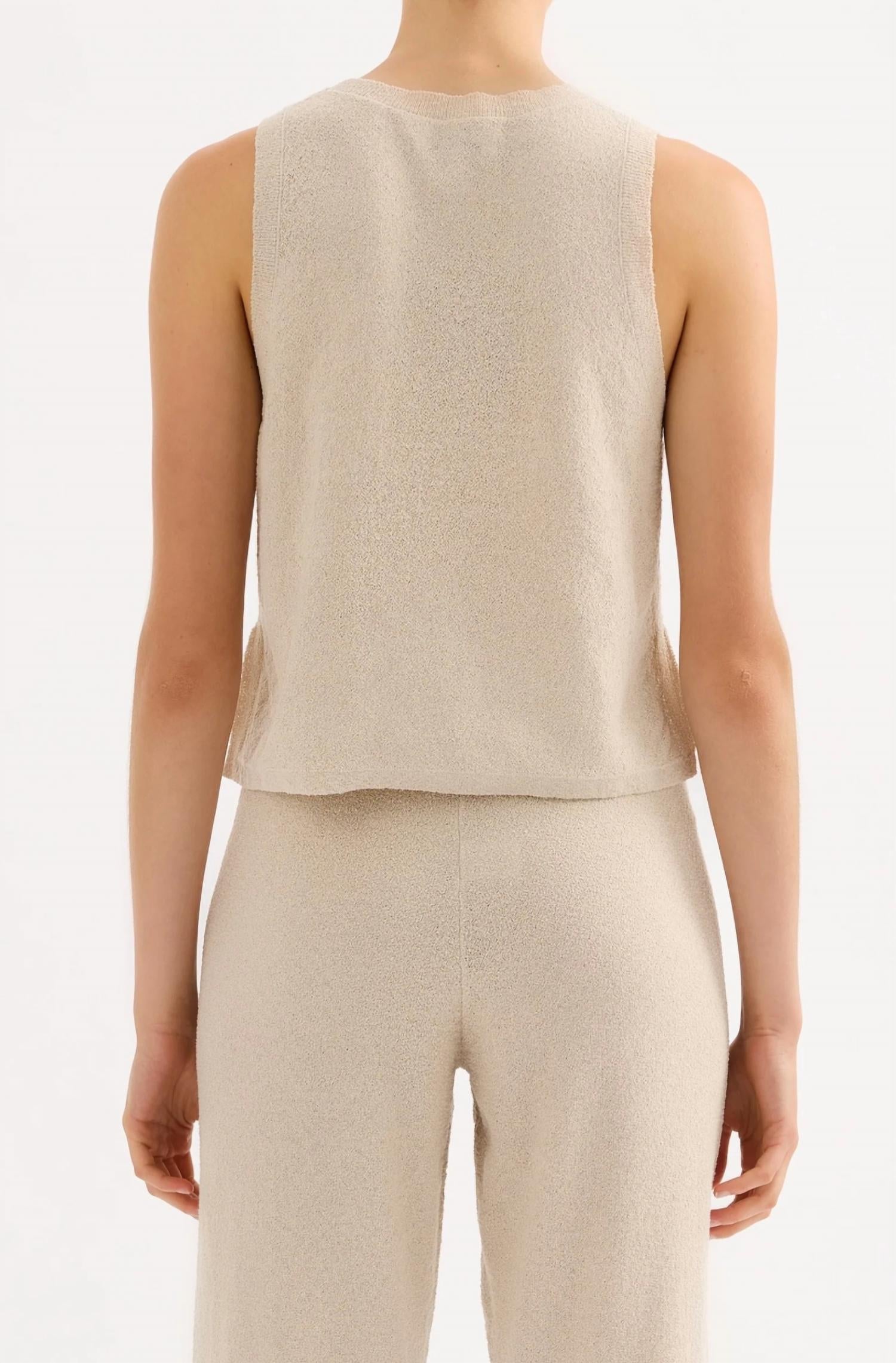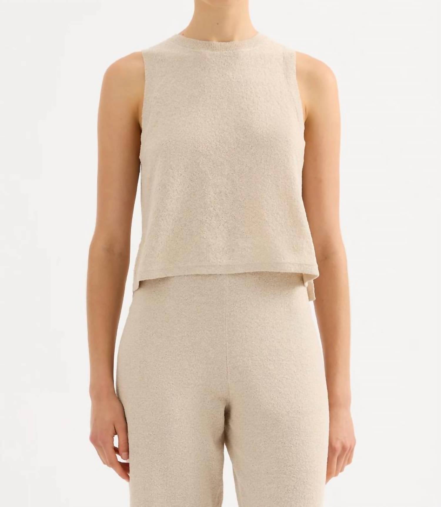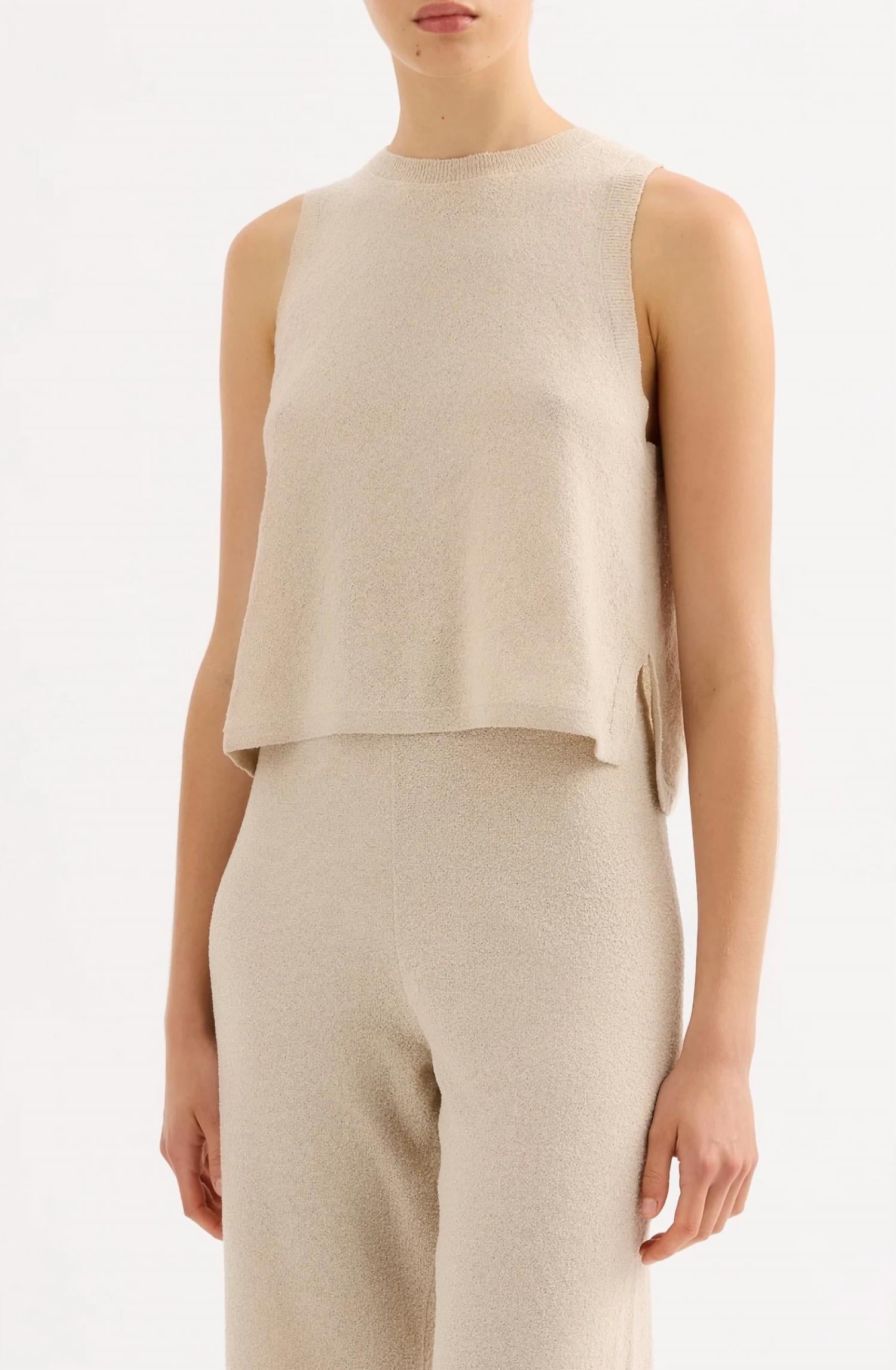 Fit, fabric and functionality. This tank top checks all the boxes. Elevate your summer wardrobe with the Women's Zosia Knit Tank by Nude Lucy in a versatile beige hue. This sleeveless tank is crafted from 100% polyester, offering a textured finish and relaxed silhouette that finishes at the hips. Designed with a narrow crew neckline, it features a stepped hem and side seam slits for added dimension. With a convenient pull-on closure, it is ideal for vacation-ready, streetwear-inspired outfits.