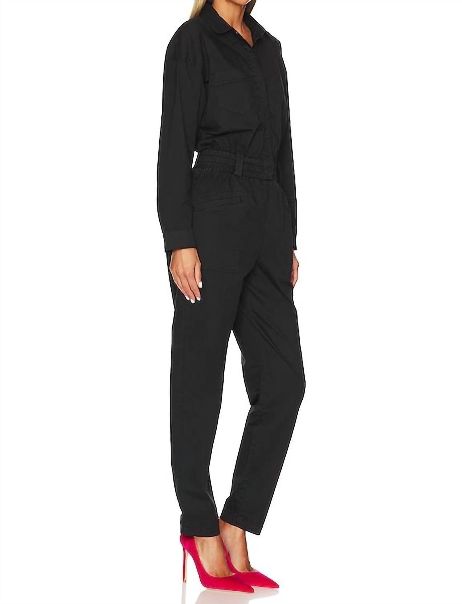 Meet the Selena Long Sleeve Pinch Waist Jumpsuit by PISTOLA, an ideal choice for your wardrobe in a versatile Fade Black hue. Crafted from a comfortable cotton blend of 98% cotton and 2% elastane, this jumpsuit features a relaxed fit with straight legs and a mid-rise elastic waistband. Made in China, it ensures ease of wear with a front snap button closure and button cuffs, complemented by a trendy 4-pocket styling. Care for this jumpsuit with simple machine wash and tumble dry instructions for convenience.