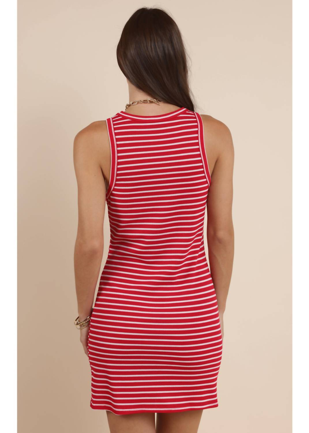 A short and breezy dress for those warmer days. Elevate your summer wardrobe with the Sun Striped Mini Dress by Sadie & Sage, a chic bodycon silhouette perfect for Valentine's Day. Designed for women, this sleeveless dress features a striking red stripe pattern and a classic crewneck. Crafted from 95% polyester and 5% spandex, it ensures all-day comfort with a pull-on closure. Care: Machine wash.