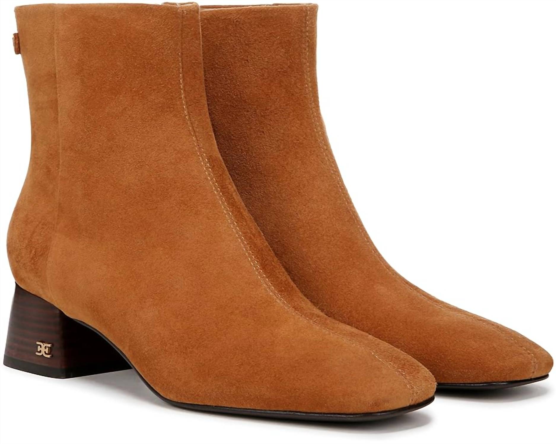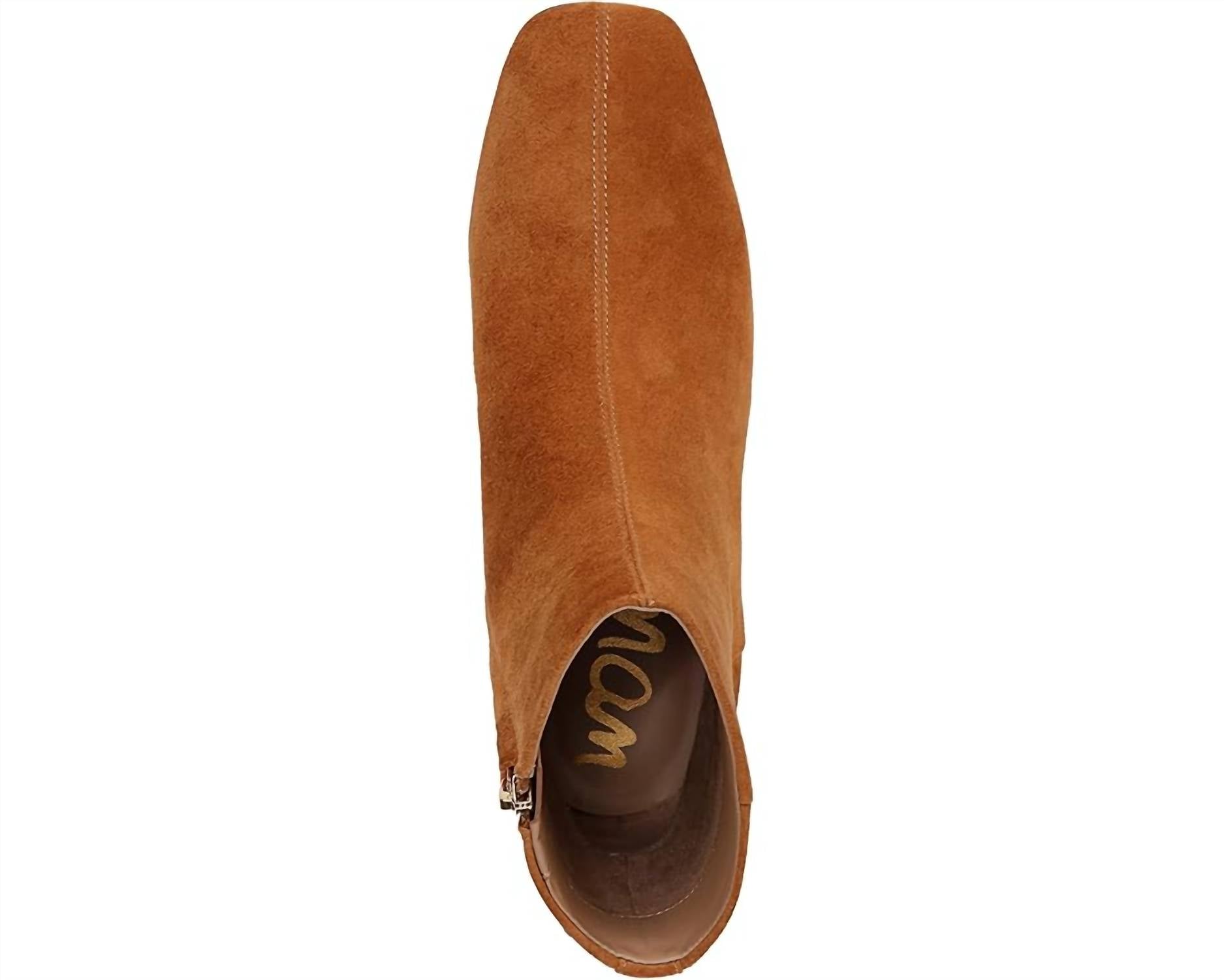 Say hello to the perfect, most versatile boot. The ankle height makes this style easily transition from day to night. Wear them with your favorite skinny jeans and tee for a more laid back look, or pair them with your favorite mini dress and jacket for a night out on the town. Step into modern chic with the Paige Ankle Bootie by Sam Edelman, offered in a stylish amber brown shade. These booties feature a suede leather upper with a side-zip closure and an almond toe for a sleek silhouette. The braided trim and fringe detail enhance its standout appeal, while a 1.5-inch stacked heel adds a subtle lift. Imported and designed with synthetic lining and footbed, these ankle booties promise a comfortable fit, with a circumference of 10.5 inches and shaft height of 5 inches.