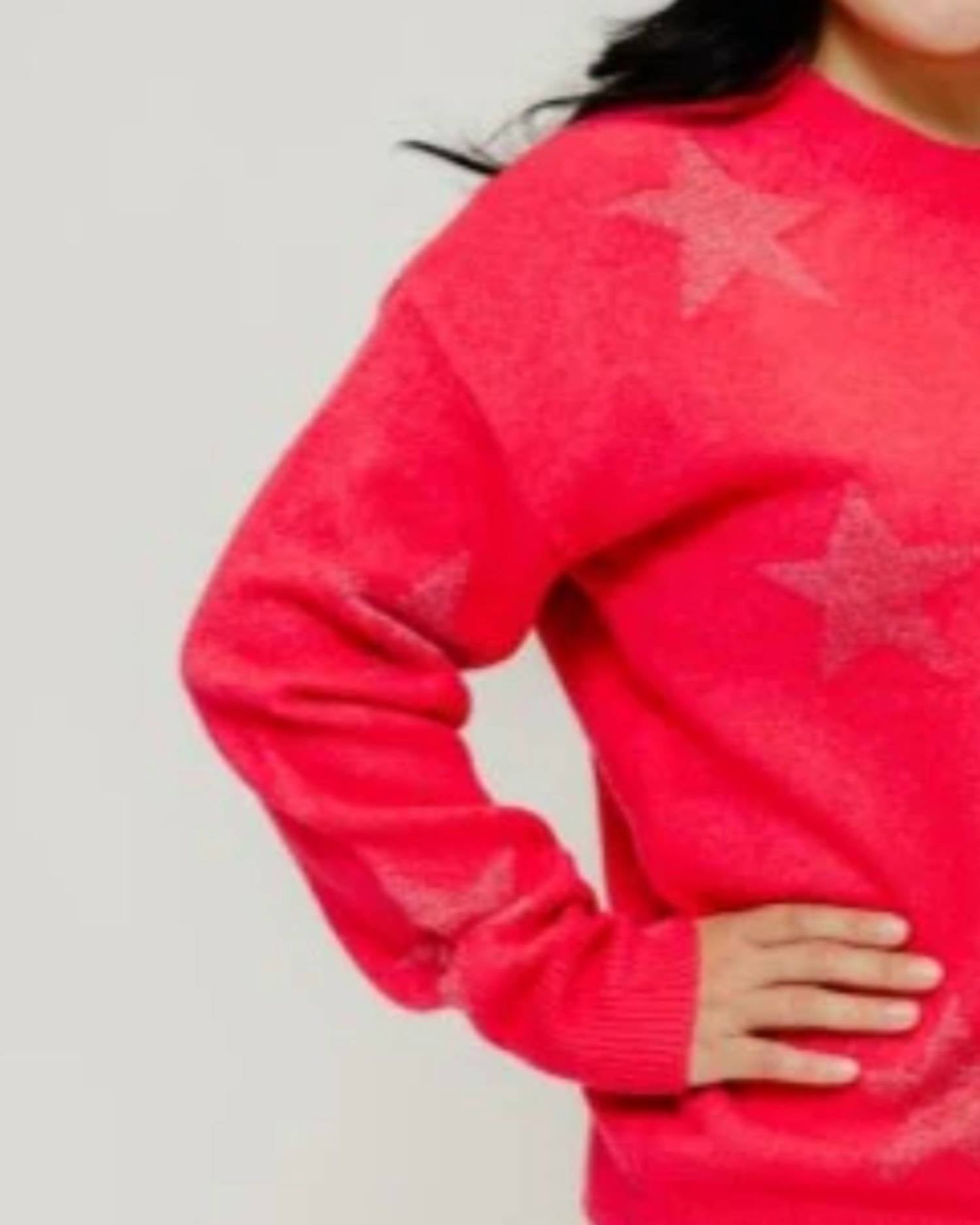 Experience the perfect blend of comfort and style with this trendy crew neck sweater, designed to effortlessly elevate your wardrobe. Pair it with your favorite denim and loafers for the perfect look. The Taylor Star Sweater by SKIES ARE BLUE is a winter essential with a touch of sparkle, perfect for travel or Valentine's Day festivities. This long sleeve sweater features a large scale graphic pattern with pink shimmer Lurex stars, all in a vibrant magenta hue. Crafted from a soft nylon blend consisting of 53% Acrylic, 19% Nylon, 16% Polyester, 6% Viscose, 4% Wool, and 2% Spandex, it offers a comfortable, maximalist style. The sweater is pull-on with a classic crewneck and requires hand washing for care. Model is 5'0", wearing a size M.