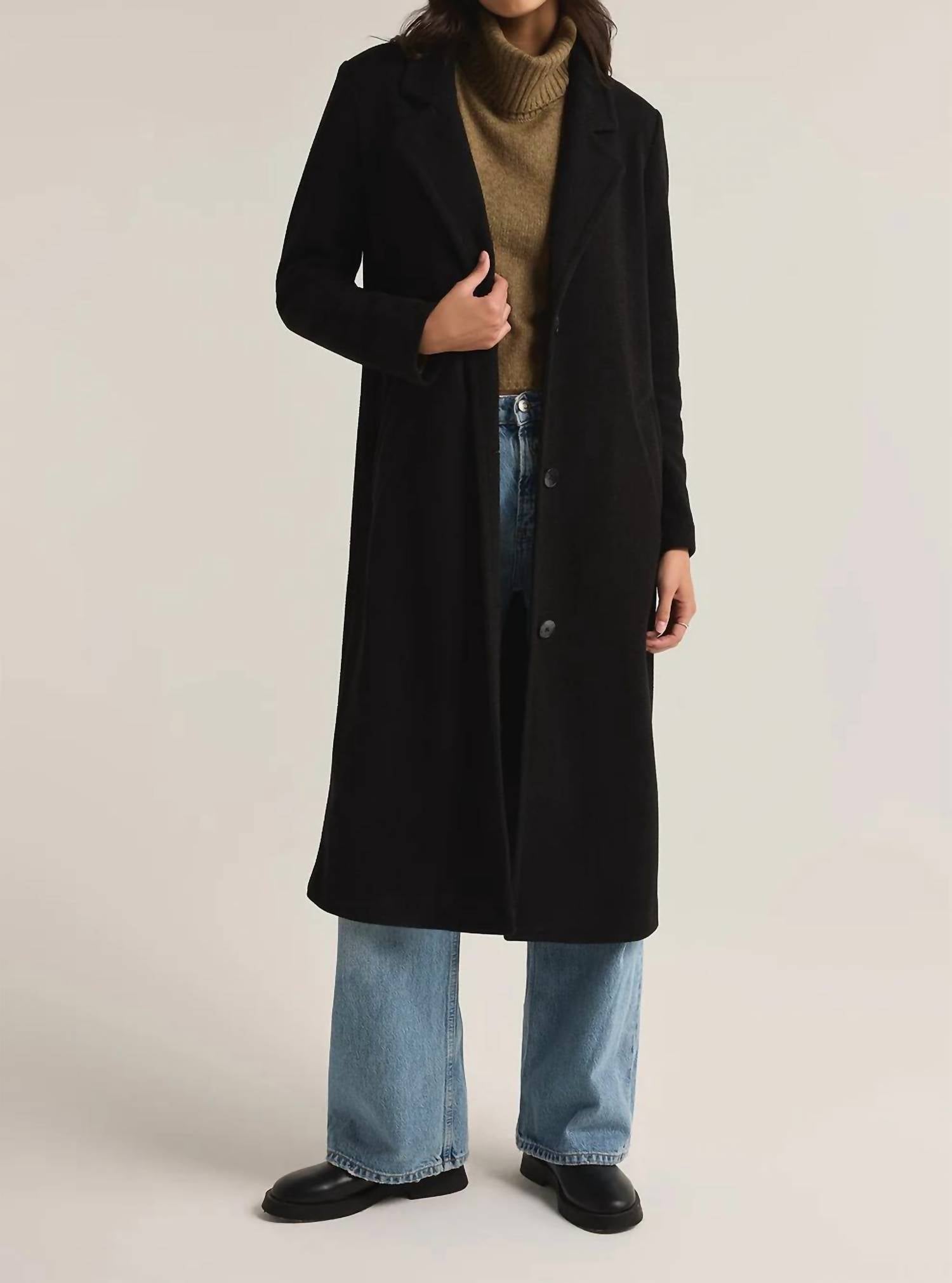 The perfect trench coat that you can throw over any outfit. Chic addition to your winter wardrobe designed for travel and workwear occasions. Solid black trench coat features long sleeves and a collared neckline, delivering timeless style. Crafted from a textured knit of 70% Polyester and 30% Nylon. Ensures warmth and durability. Button closure. Dry clean.