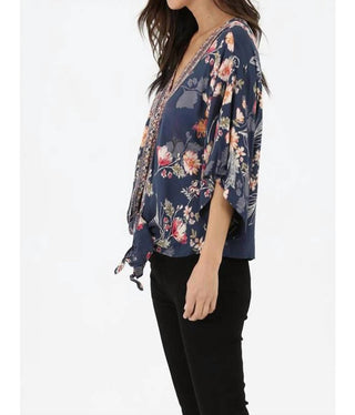 Nostalgia - V Neck Tie Waist Kimono Sleeve Blouse