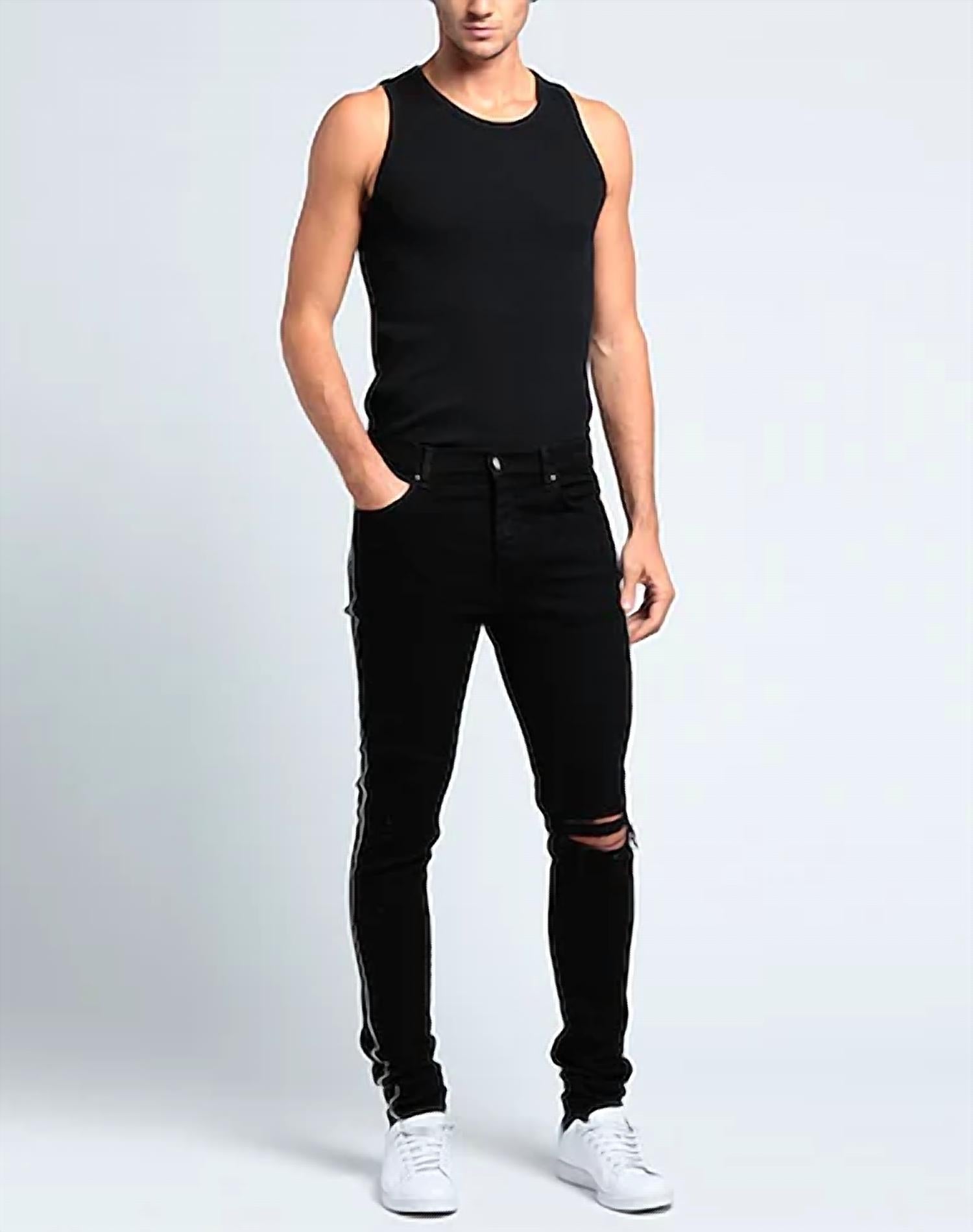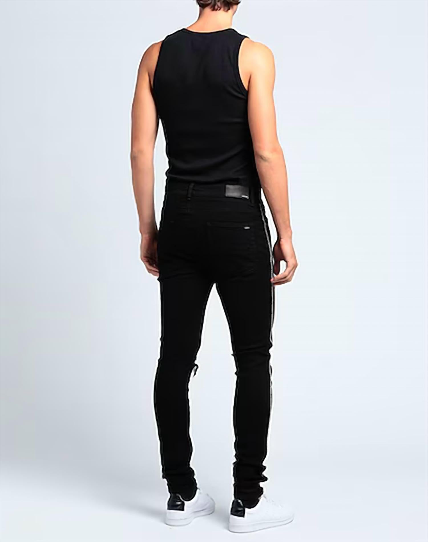 Explore the Crystal Track Denim Jeans by Amiri, designed for the modern man. These jeans feature a mid-rise fit with a relaxed, straight leg style in the versatile Black Od shade. The cotton blend material ensures comfortable wear, while a hidden button closure and five-pocket design add functionality. Perfect for minimalist spring trends and ideal for holiday parties like Thanksgiving, these jeans are a stylish addition to any wardrobe.