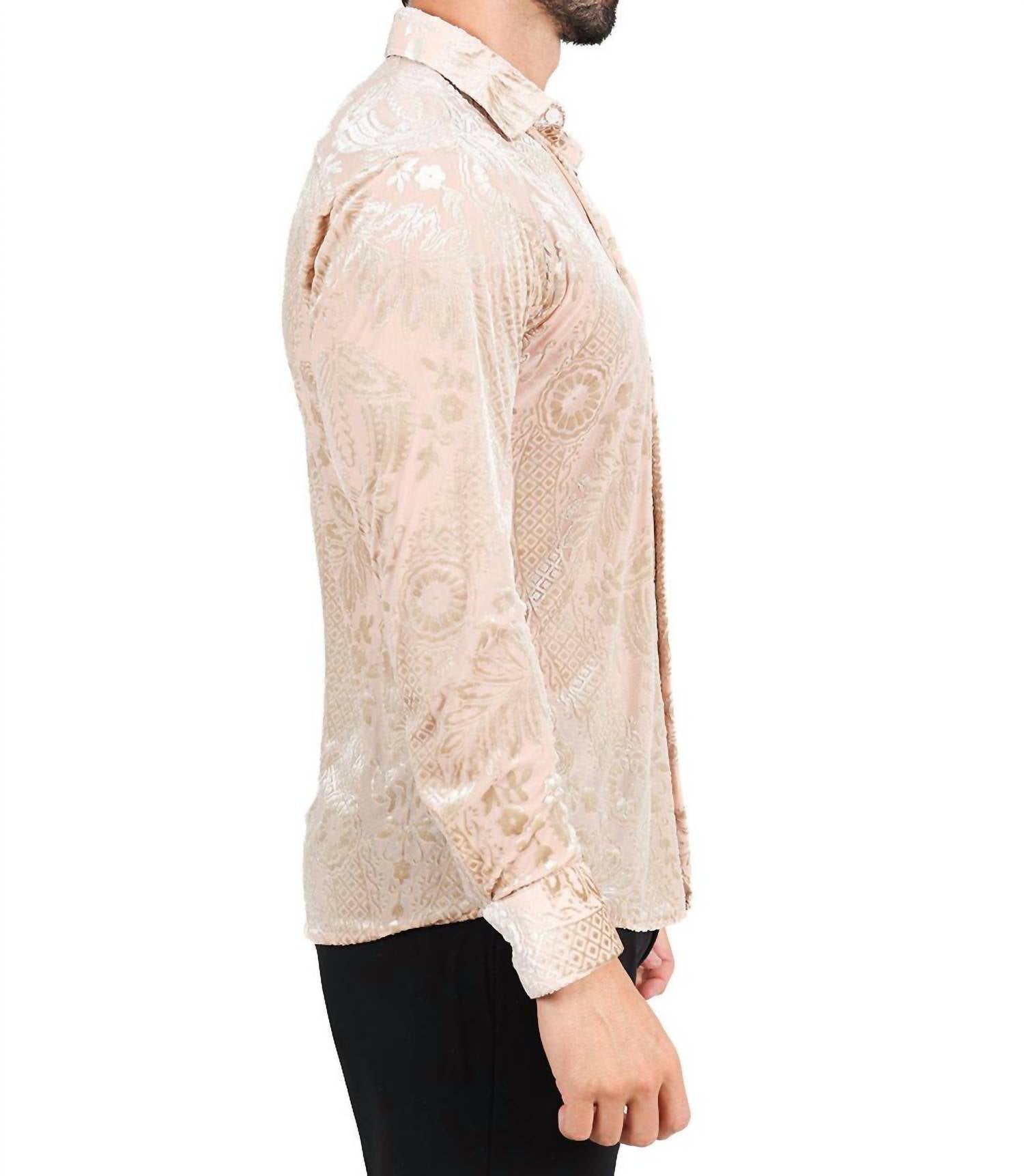 Introducing the Floral Galore Long Sleeve Shirt by BARABAS, a luxurious addition to your wardrobe in a cream hue. This men's casual button-down shirt features a see-through floral paisley design perfect for a holiday party, complete with a classic collar and long sleeves. Expertly crafted from a 97% cotton and 3% spandex blend, this lightweight shirt is imported and secured with button fastenings. Care instructions recommend dry cleaning and avoiding bleach for optimal longevity.