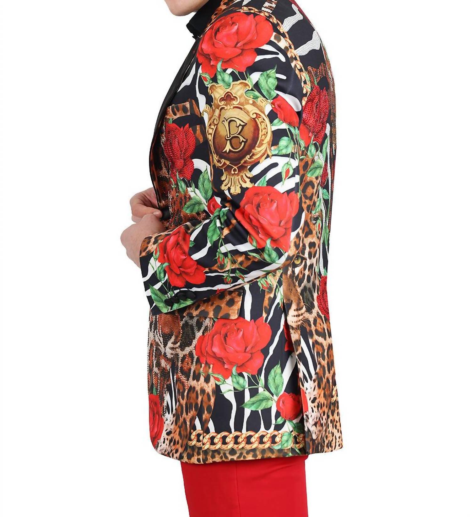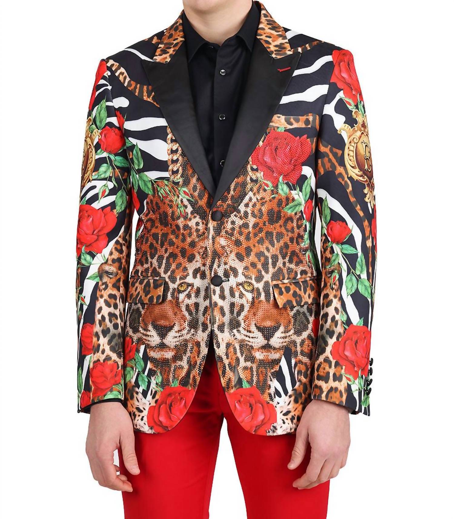 Elevate your formalwear with the Hunting Battle Blazer from Barabas, a statement piece with its striking leopard, zebra, floral, and chain pattern. Crafted with long sleeves and a satin notch lapel collar, this blazer blends style with comfort in a slim fit design. Composition: 94% Regenerated fiber, 3% Spandex. Closure: Two-button with four-button cuffs. Care: Dry clean only. Featuring front welt chest and hip pockets as well as an interior pocket, this regular-length blazer is perfect for any cocktail party or fall occasion.