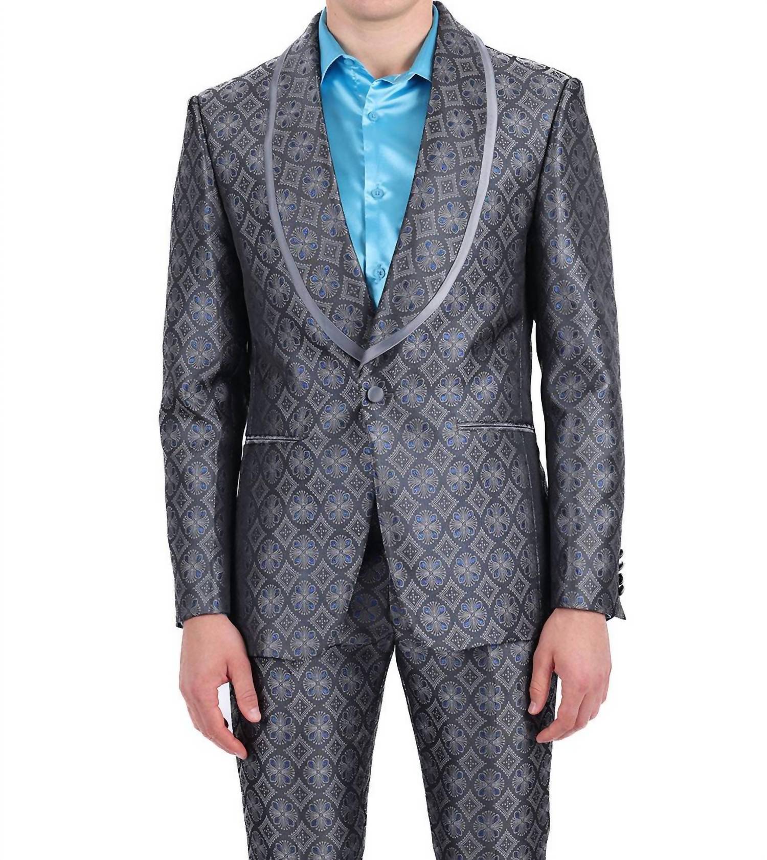 Experience the refined allure of the Majestic Mod Blazer by BARABAS, crafted with long sleeves for a sophisticated look. Made from 100% regenerated fiber, this grey blazer showcases a decorative geometric pattern and features a shawl lapel. With a sleek, slim fit and a one-button closure, it also includes front welt chest, hip pockets, and an interior pocket for functionality. Care instructions: Dry clean only.