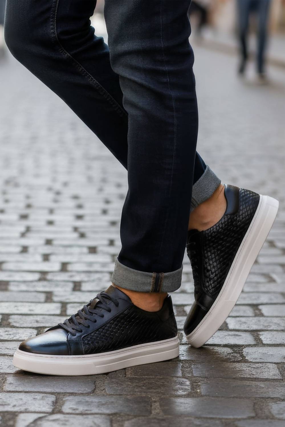 Step up your footwear game with the Men's Stately Show Low Top Sneakers by BARABAS. These black sneakers feature a leather upper and lining, complemented by a durable rubber sole and cushy memory foam insole for all-day comfort. The weave-pattern design ensures breathability and enhances the sleek, round-toe silhouette, while the matching color sole provides a unique touch. With a flat heel style under 1" high, these sneakers are perfect for any stylish occasion. Upper and lining material: Leather. Sole: Rubber. Spot clean.