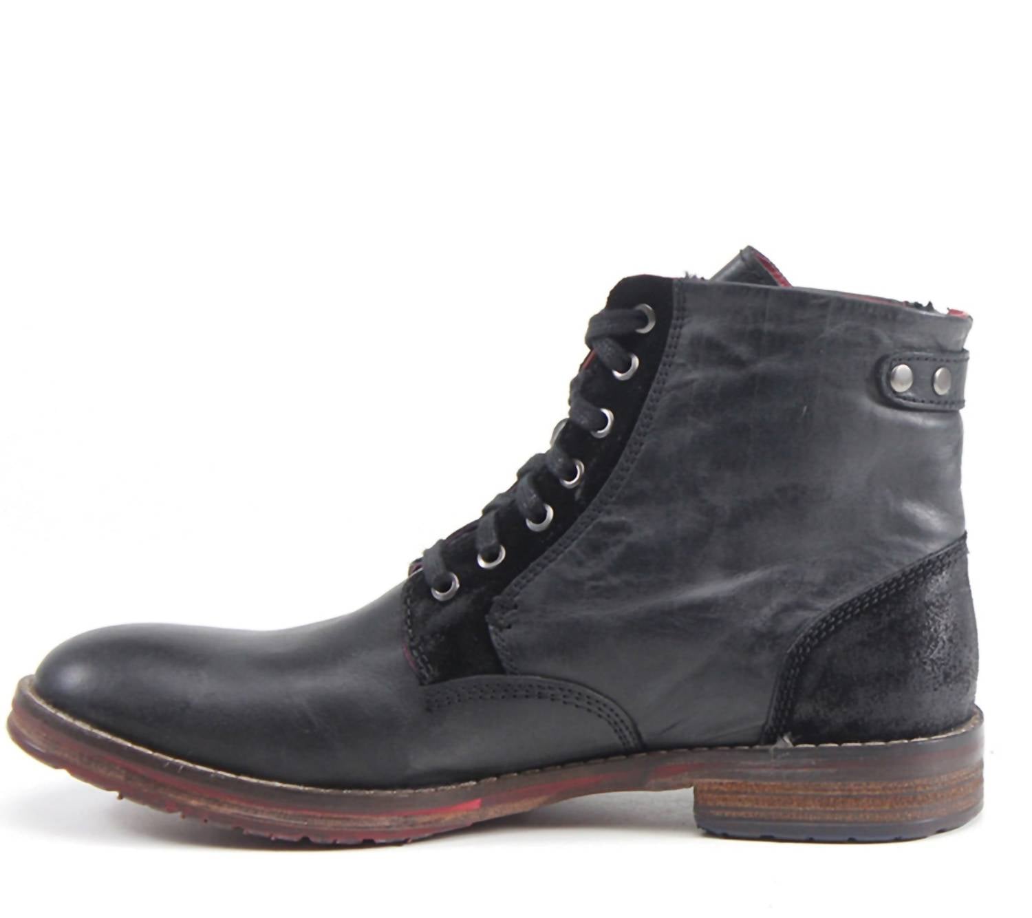 Discover the Men's Ball Of Fire Leather Boots by DIBA True, a unique blend of genuine leather and suede in a striking hue. Featuring a convenient lace-up vamp, these boots combine sleek materials across the vamp and heel, accented by a side zipper and velcro strap for an edgy, urban flair. Heel height settles comfortably at a regular 1-inch block heel, designed with a lug sole for added traction. Ideal for vintage-inspired travel looks, these boots suit the fall season beautifully.