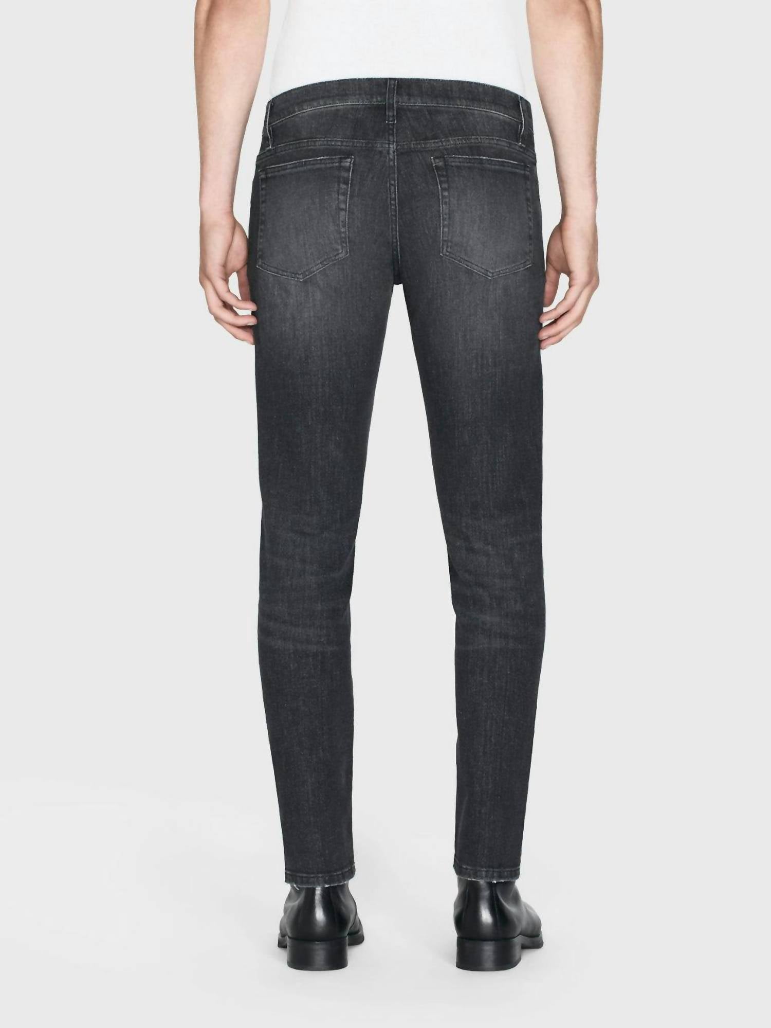 Introducing the FRAME L'homme Slim Fit Jeans in Daxton Dark, blending timeless style with modern comfort. This men's denim features a mid-rise waist and a slim fit that tapers elegantly from the classic straight leg to a skinny leg opening, with dimensions of a 9.75" rise, 32.5" inseam, and 13.625" leg opening. Crafted from a smooth cotton blend of 69.50% cotton, 24% recycled cotton, 5.50% recycled polyester, and 1% elastane, it ensures a comfortable stretch while maintaining durability. The jeans boast a button closure and a classic five-pocket design, perfect for workwear or vacations. Care is simple with machine wash and tumble dry instructions.