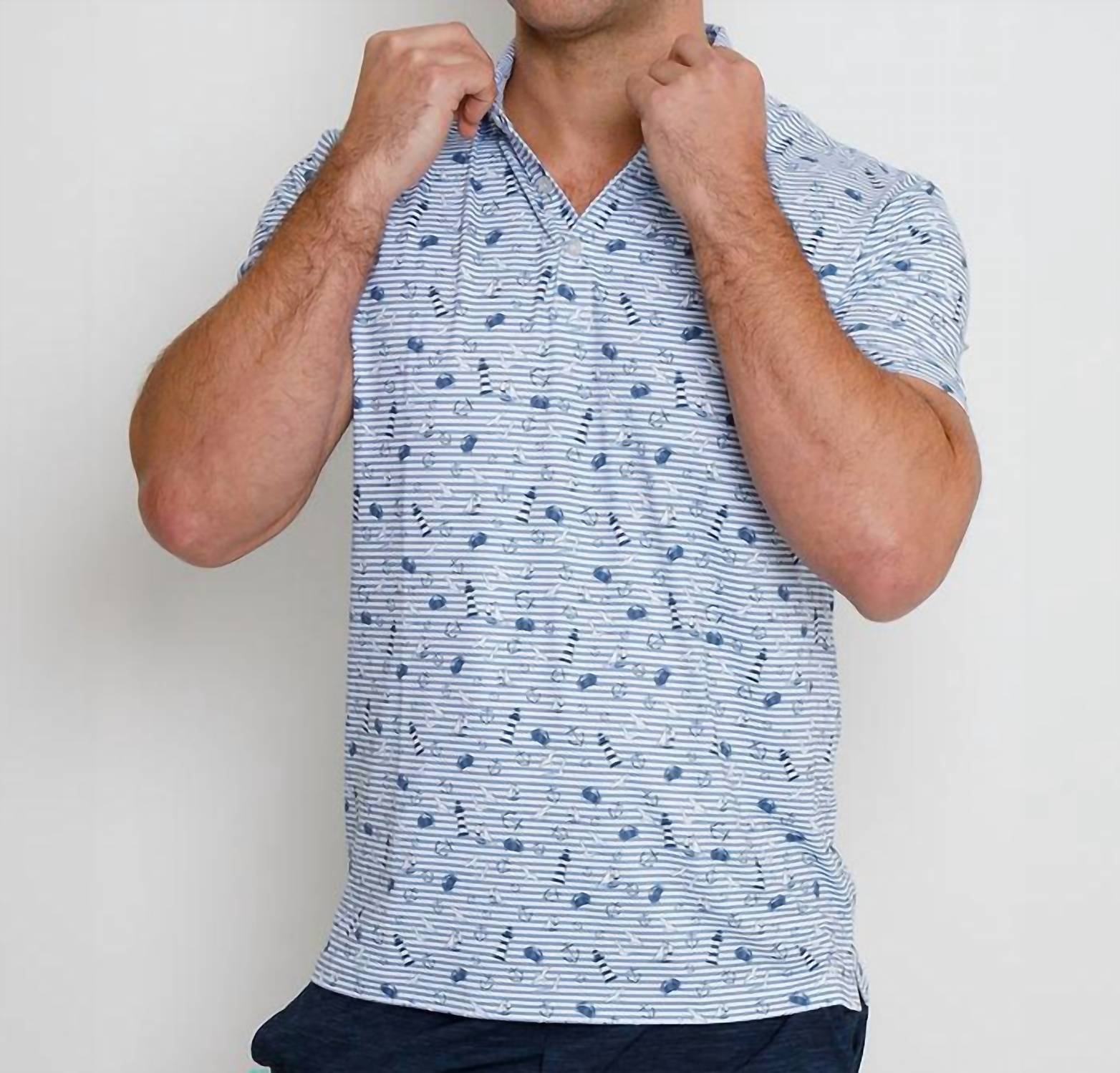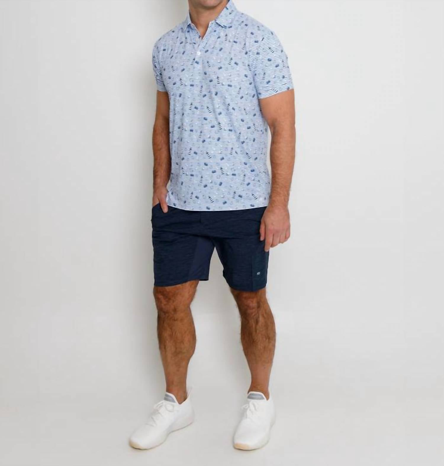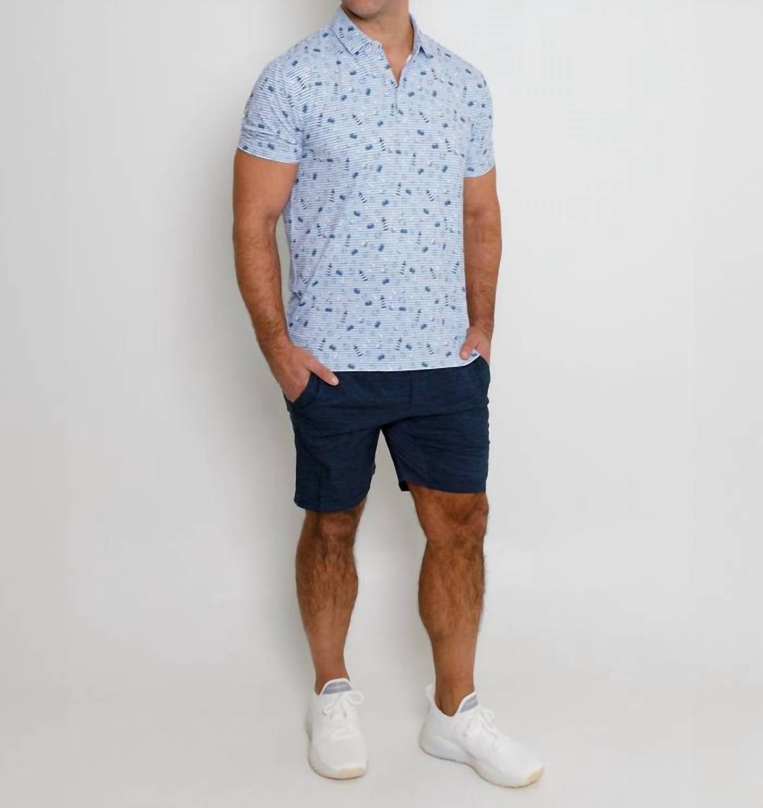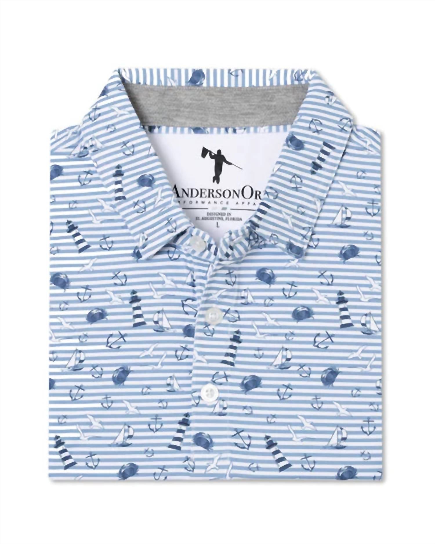 Experience the Marina Polo by AndersonOrd, a stylish choice for a summer-ready, preppy look. This men's polo comes in a Faded Denim hue featuring a graphic pattern with a classic collar and short sleeves. Made from polyester and designed without pockets, it offers a comfortable pull-on closure for ease of wear. Care: Machine wash and tumble dry for effortless maintenance.