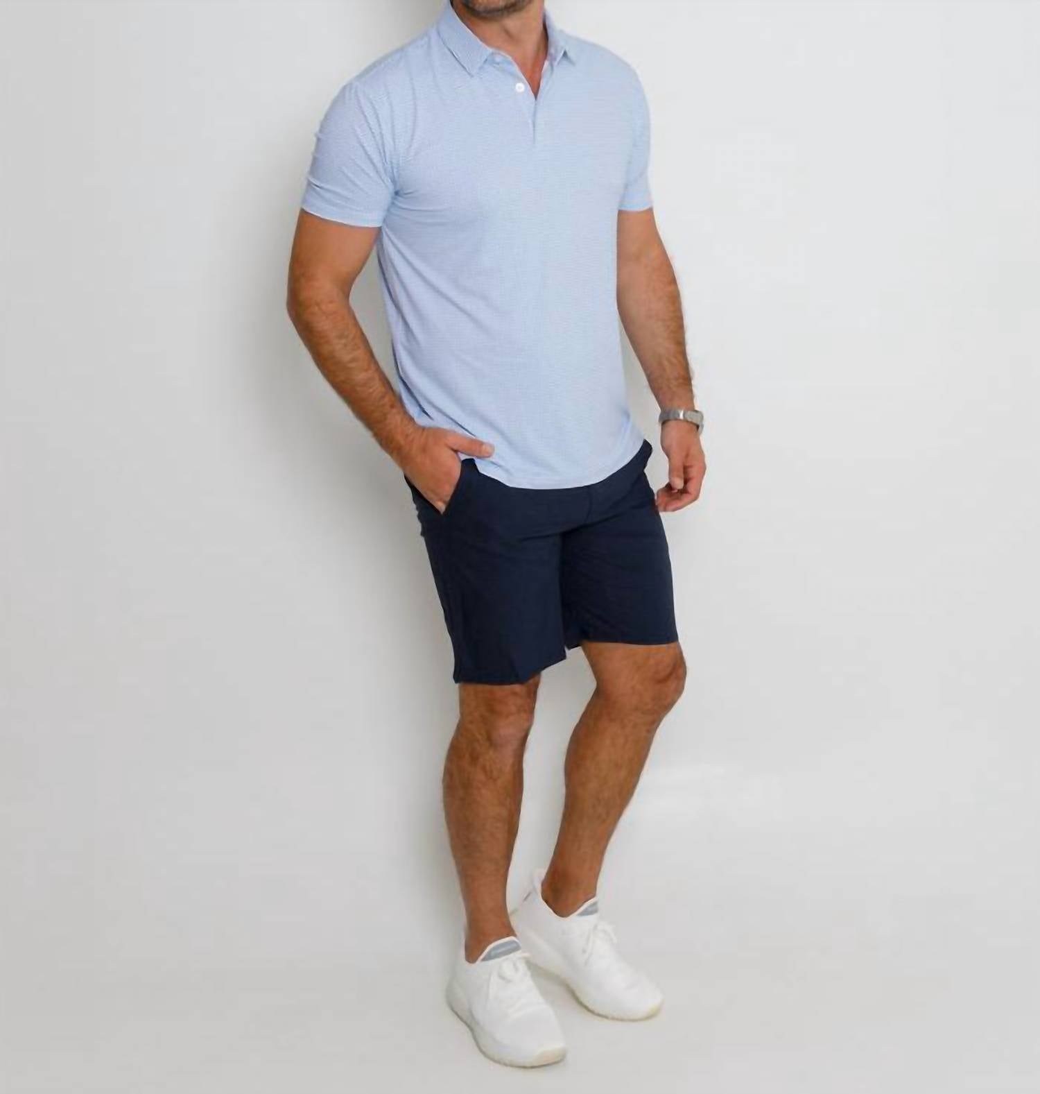 Introducing The Em Polo by AndersonOrd, a stylish choice for the modern man. This patterned polo features short sleeves and a classic collar, crafted from high-quality polyester. Designed in a sophisticated blend of White, Federal Blue, and Blue Fog, it offers effortless pull-on convenience. Care is simple with machine wash and tumble dry instructions, making it perfect for summer wear.