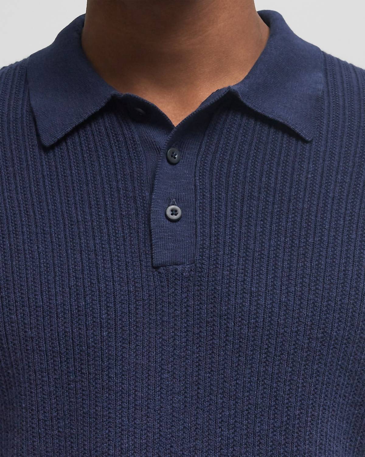 Introducing the Sunset Polo by Edmmond Studios, a refined choice for the modern man. This navy short sleeve polo boasts a solid cotton composition for optimal comfort and breathability. Made in Portugal, it features a classic collar neckline and a stylish three-button front closure. Care is hassle-free with machine wash and tumble dry instructions.