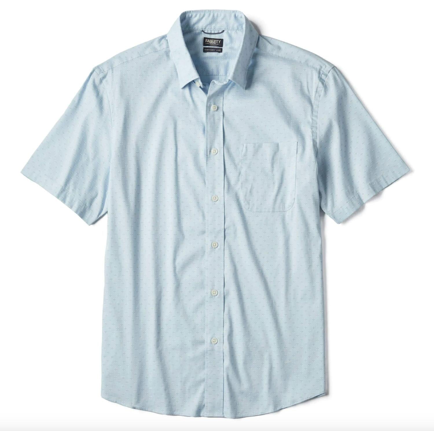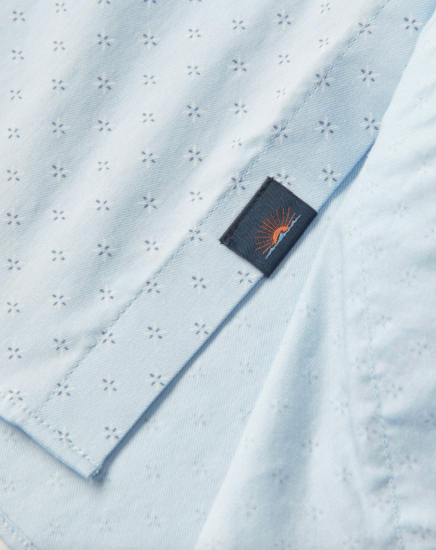 Stay comfortable and stylish with the Faherty Men's Movement Short Sleeve Sport Shirt in Blue Sand Diamond, featuring a relaxed fit with a straight silhouette from chest to hem. This patterned shirt includes short sleeves, a spread collar with concealed buttons, and a button front placket, enhancing its casual yet polished appeal. Crafted from a blend of 55% Supima Cotton, 25% Recycled Nylon, 16% Lyocell, and 4% Elastane, this shirt offers flexibility and comfort. Care instructions recommend turning inside out and machine washing cold with like colors on a gentle cycle; tumble dry low and use a cool iron when needed.