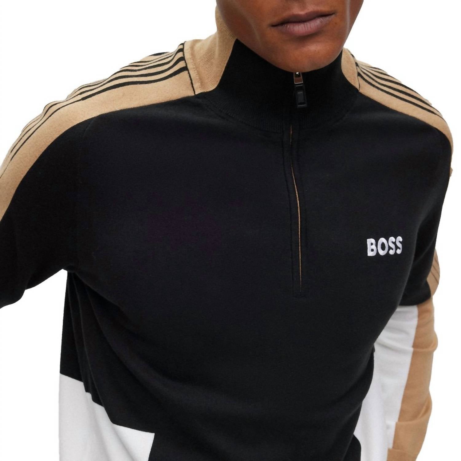 Elevate your fall travel wardrobe with the Black Zolkar Sweater by Hugo Boss, a stylish essential for men. This cotton blend turtleneck features long sleeves with a striking color block pattern and an embossed logo on the chest and back. Its convenient half zip closure enhances both comfort and style, while the composition of 79% cotton, 20% polyester, and 1% elastane ensures durability. Cleaning is a breeze with machine wash care instructions.