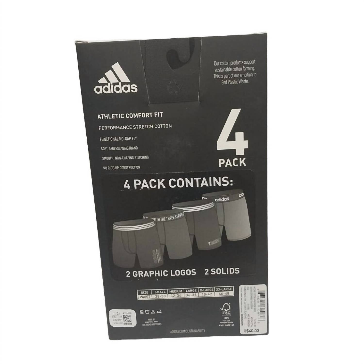 Discover the Men's 4 Pack Boxer Briefs by Adidas, crafted for optimal athletic comfort with a stretch polyester blend. These boxer briefs come in a sleek combination of teal and gray, showcasing a stripe pattern for a modern touch. With a mid-rise waist and full coverage, they ensure superb support and fit. Easy to maintain, simply machine wash as needed.