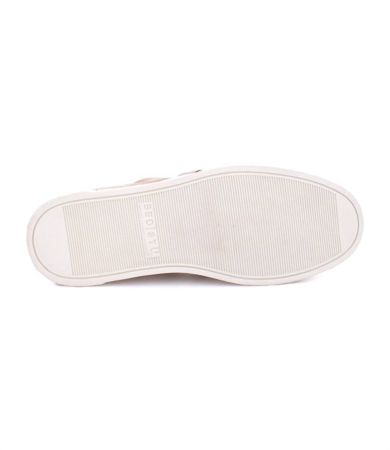 Introducing the Men's Lighthouse Sneakers by BEDSTU, a nod to retro style with a two-stripe detail reminiscent of the 70s. These tan low-top sneakers are crafted with chrome and formaldehyde-free vegetable-tanned leather, featuring a 6-eye lace-up design with metal grommets and a padded heel collar. Handmade in Leon, Mexico, they boast a breathable, cushioned insole made with natural latex and a lightweight white cup outsole with a 1-inch heel. Perfect for everyday wear, these sneakers ensure comfort without compromising style, fit true to size, and can be worn barefoot without any odor concerns.