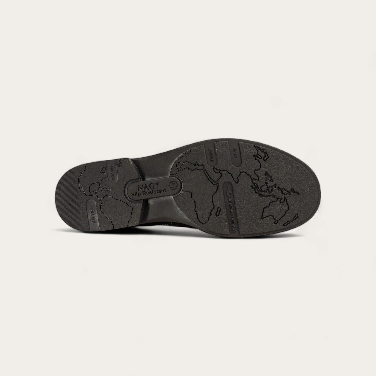 Step into sophistication with the Men's Director Slip On Shoes by NAOT, crafted in elegant Black Velvet Nubuck Black Raven. Featuring a round toe and block heel style, the shoe provides a 1.75-inch heel height for added elevation. The easy slip-on design is complemented by a padded heel cup and back sides for maximum comfort, with a slip-resistant thermoplastic rubber sole for day-long wearability. These orthotic-friendly shoes include a removable footbed and are constructed with Strobel hand-sewn technique, offering both durability and flexibility.