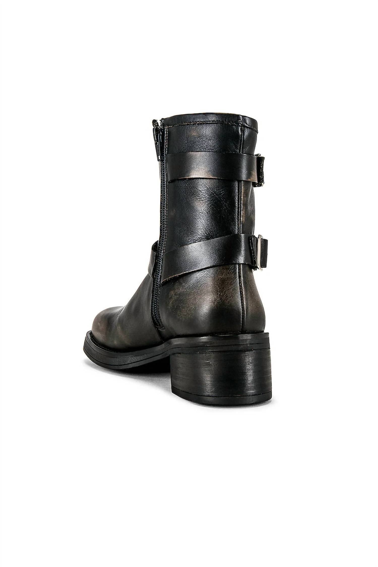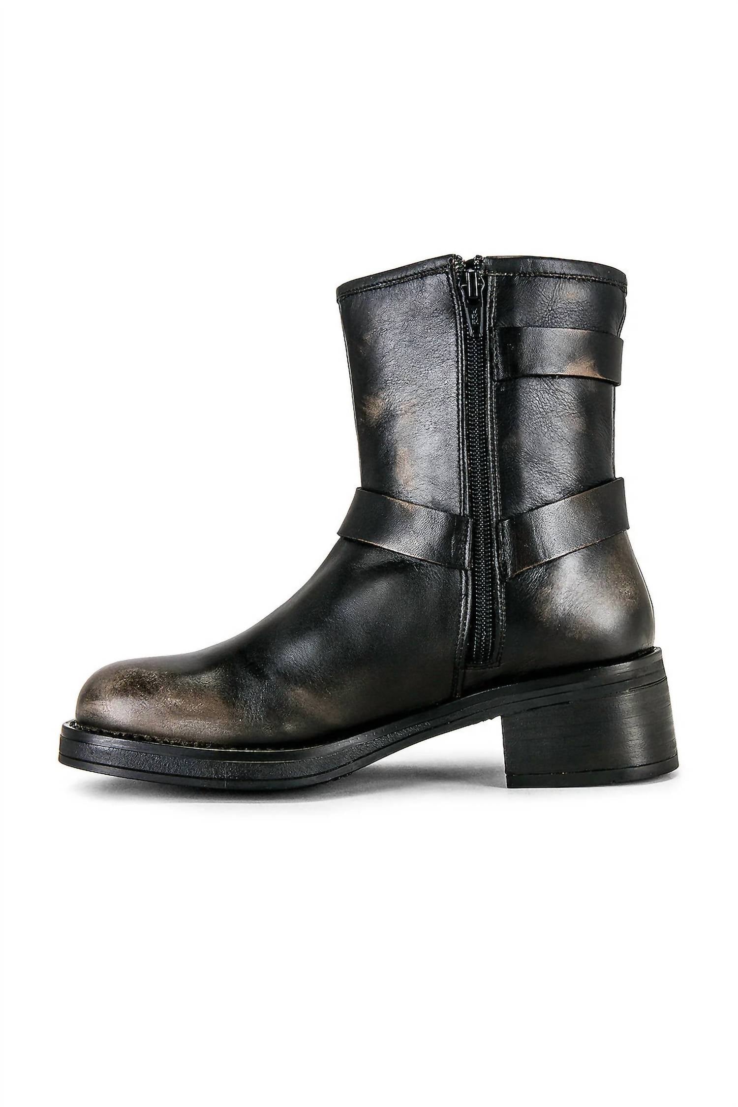 So versatile, you can wear these boots with your favorite jeans or even a dress for a more feminine feel. Elevate your fall look, perfect for travel and preppy styles. Crafted from a black distressed leather upper and feature a rubber sole, with sleek silver-tone buckled hardware and an O-ring accent. Made in Mexico. Offer a side zipper closure for easy wear, complemented by a faux leather footbed and lining for added comfort. Boast a distinctive square toe with a wooden block heel.