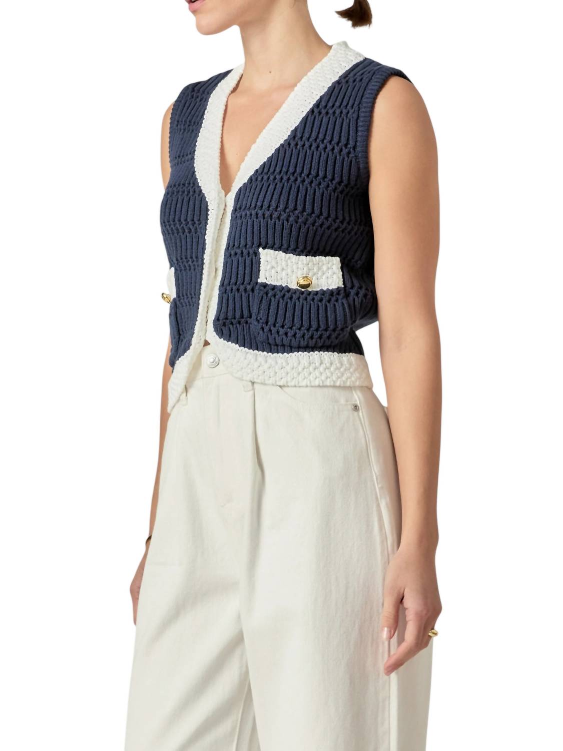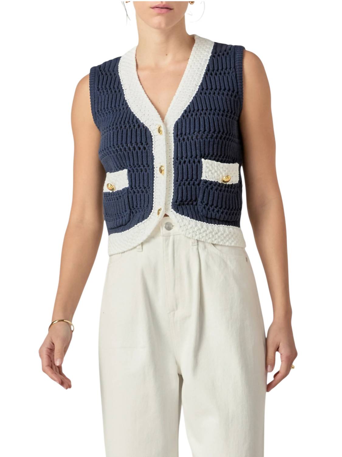 Throw this vest over an all black outfit for a perfectly polished look. Elevate your wardrobe with the Contrast Sleeveless Knit Vest by 2.7 August Apparel. This women's vest, in a striking navy and white, showcases shiny gold buttons against a chunky cotton-blend knit of 60% cotton and 40% acrylic. The cropped length and V-neck design make it perfect for layering or wearing on its own, while front button closure adds a touch of charm. Crafted with imported quality, it requires hand washing and flat drying for care.