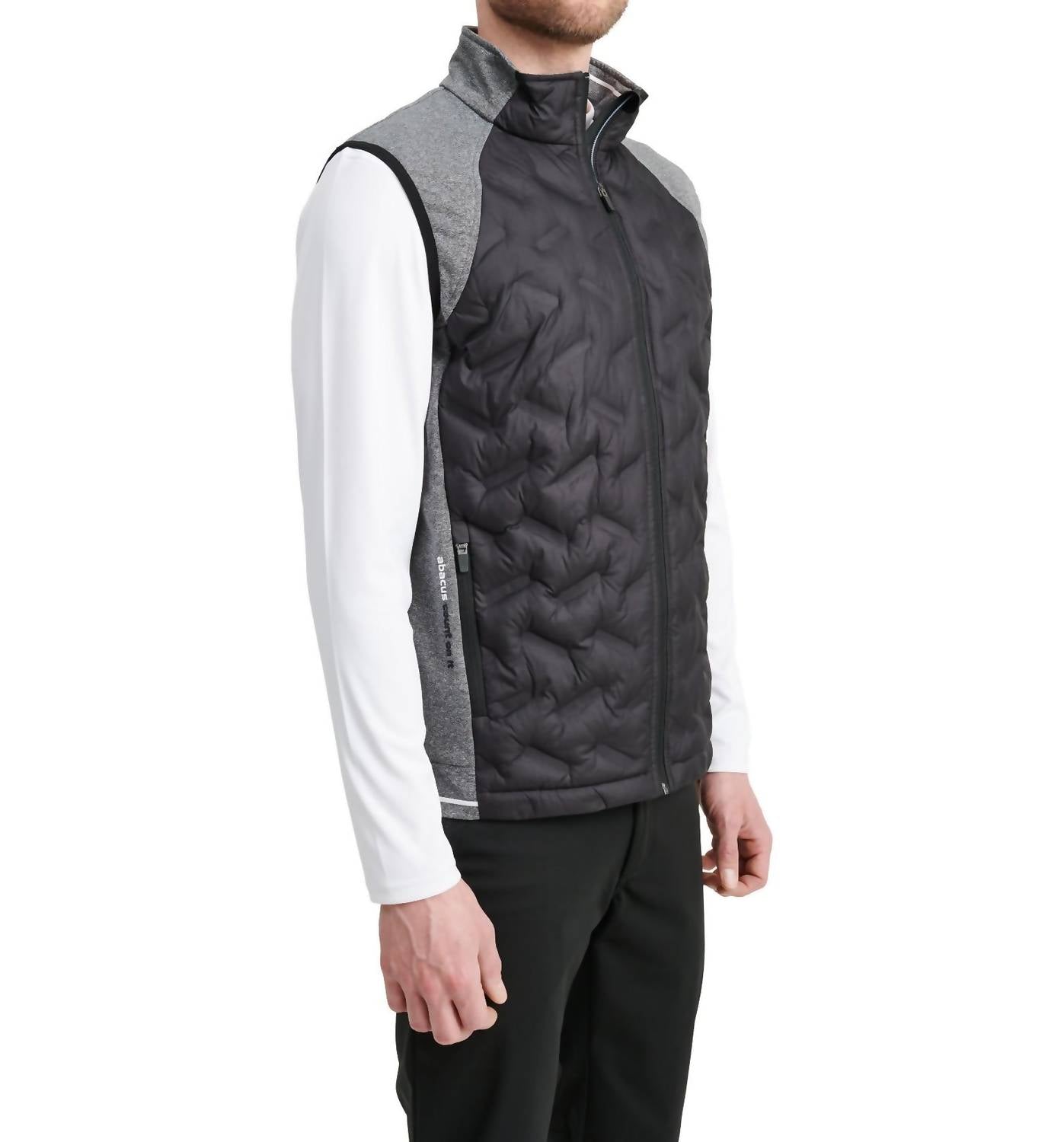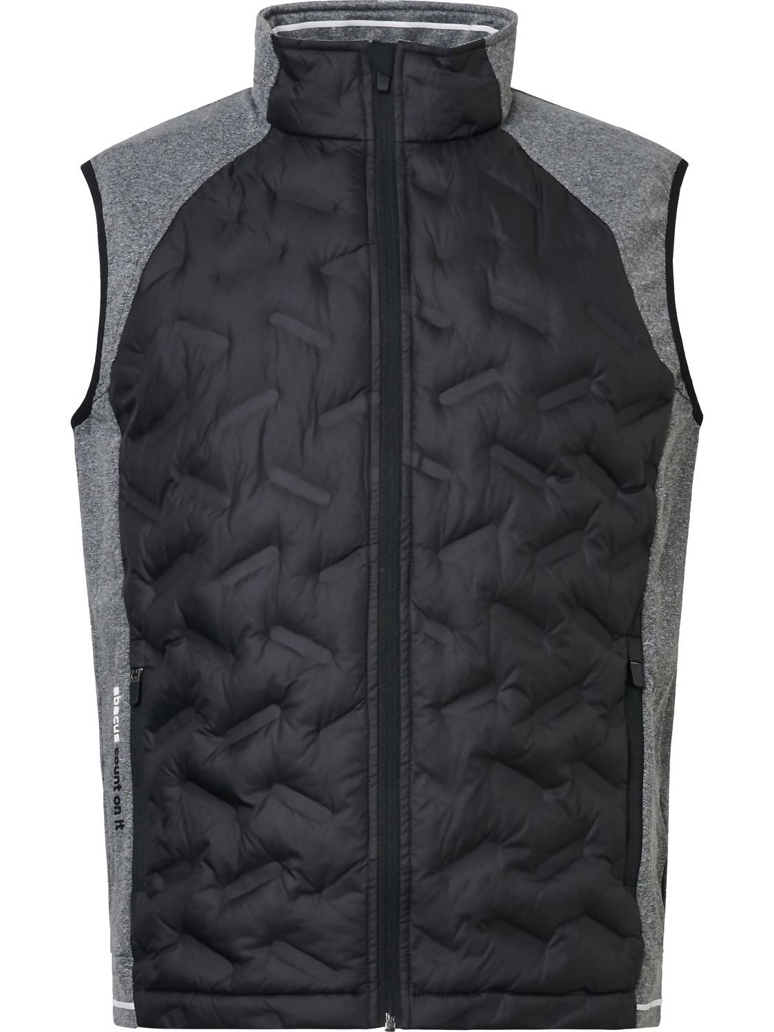 Introducing the Grove Hybrid Vest by Abacus Sportswear US, perfect for those chilly winter days with its windproof, seamless quilted fabric. This sleeveless vest, crafted from durable Polyester, features a full zip closure for added convenience. It sports stretchable fleece side panels and shoulders for enhanced mobility, with a unique contrast stripe detailing the bottom and collar. Two front zippered pockets add practicality while the Abacus logo highlights the stylish design in patterned Black Antracit.
