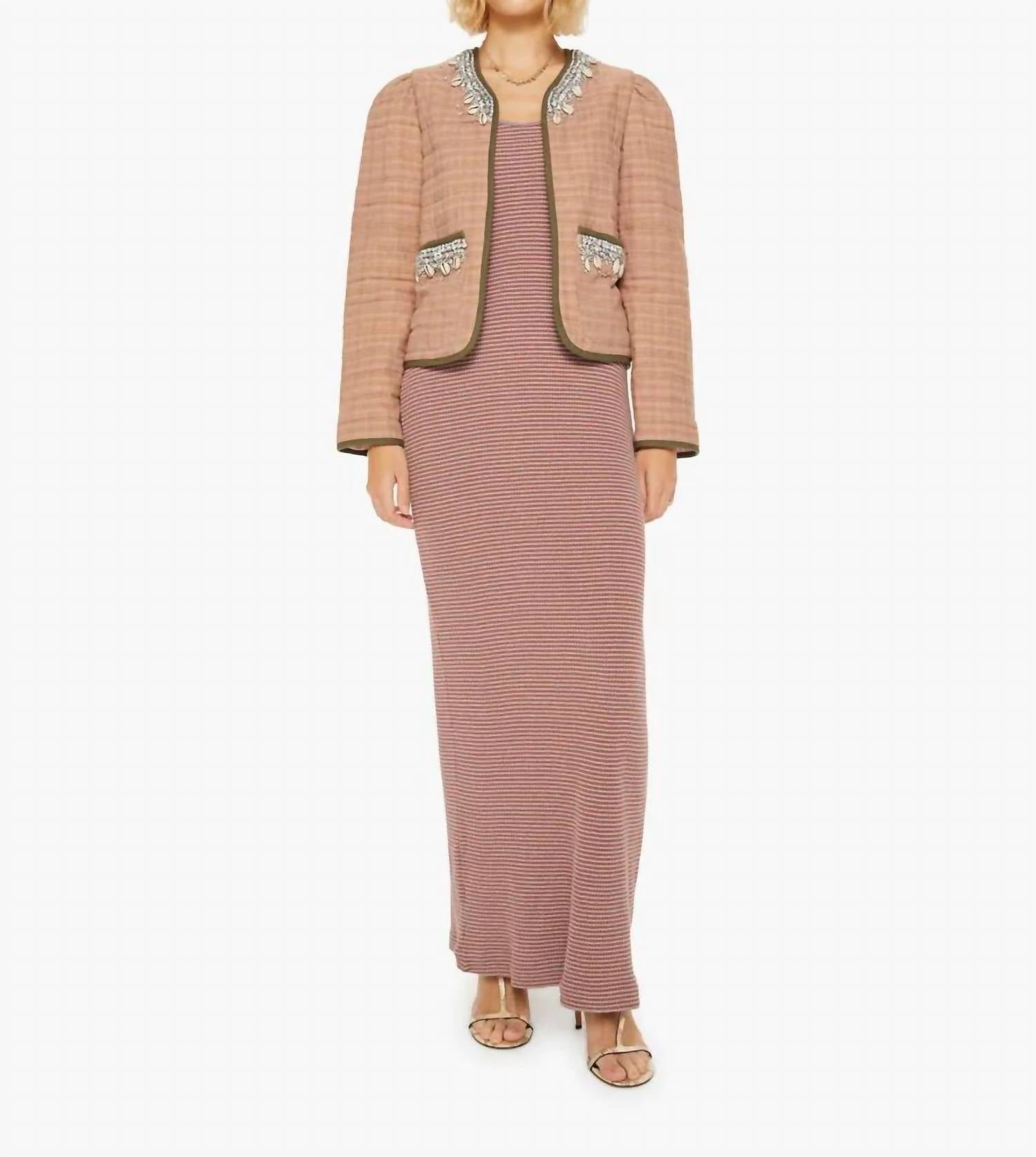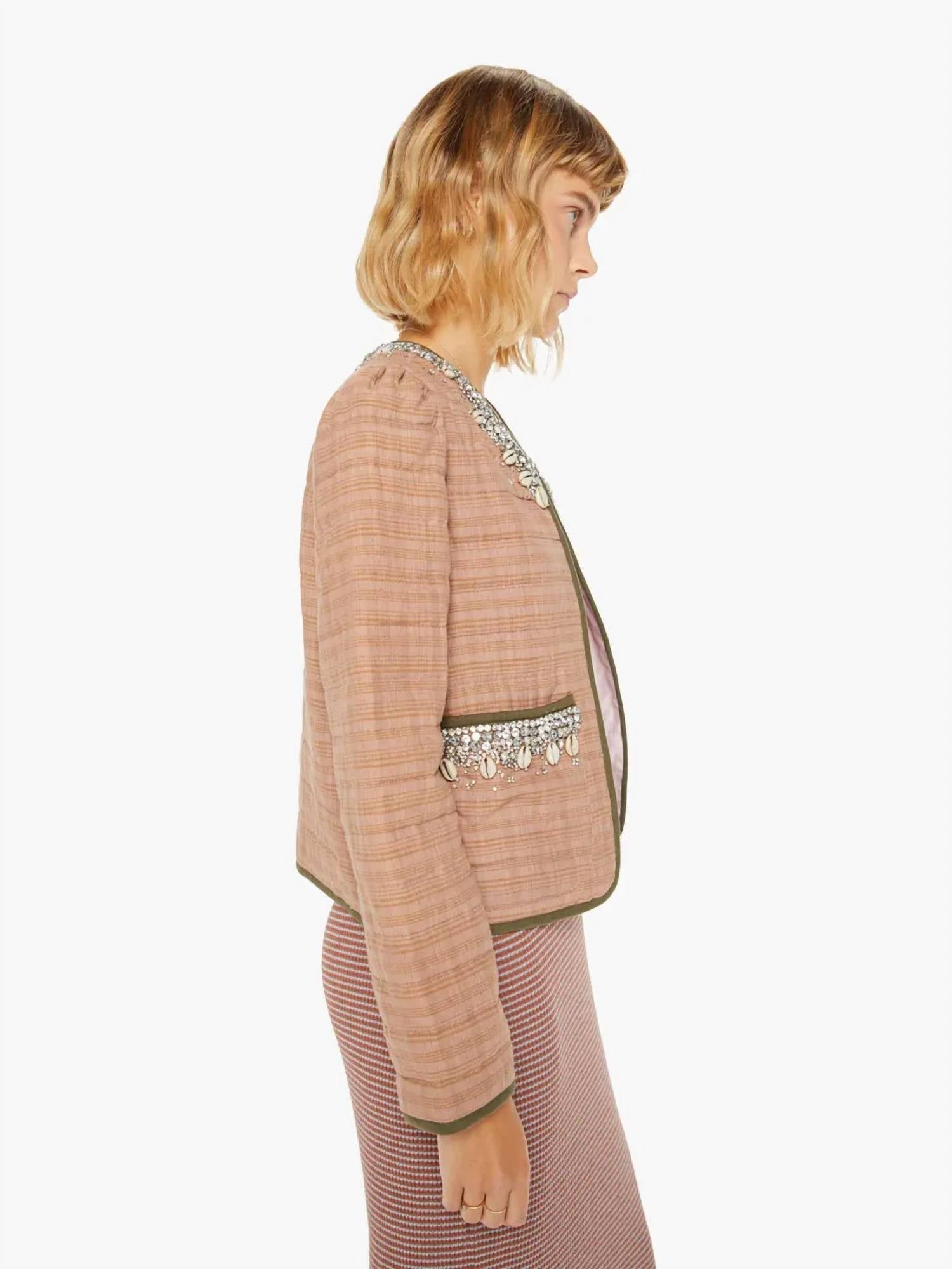 Introducing the Pasha Shell And Gem Jacket by ALIX OF BOHEMIA, a standout piece in pale plaid jute that seamlessly elevates your wardrobe. This long sleeve jacket is crafted from 100% cotton, featuring hand-embellishments with diamanté and cowrie shells, making it a unique vintage-inspired choice. With a cropped length and contrast binding, it includes practical patch pockets and a luxurious lining of 50% cotton and 50% silk. Made in India, it is a testament to traditional craftsmanship and is recommended for professional dry cleaning only.