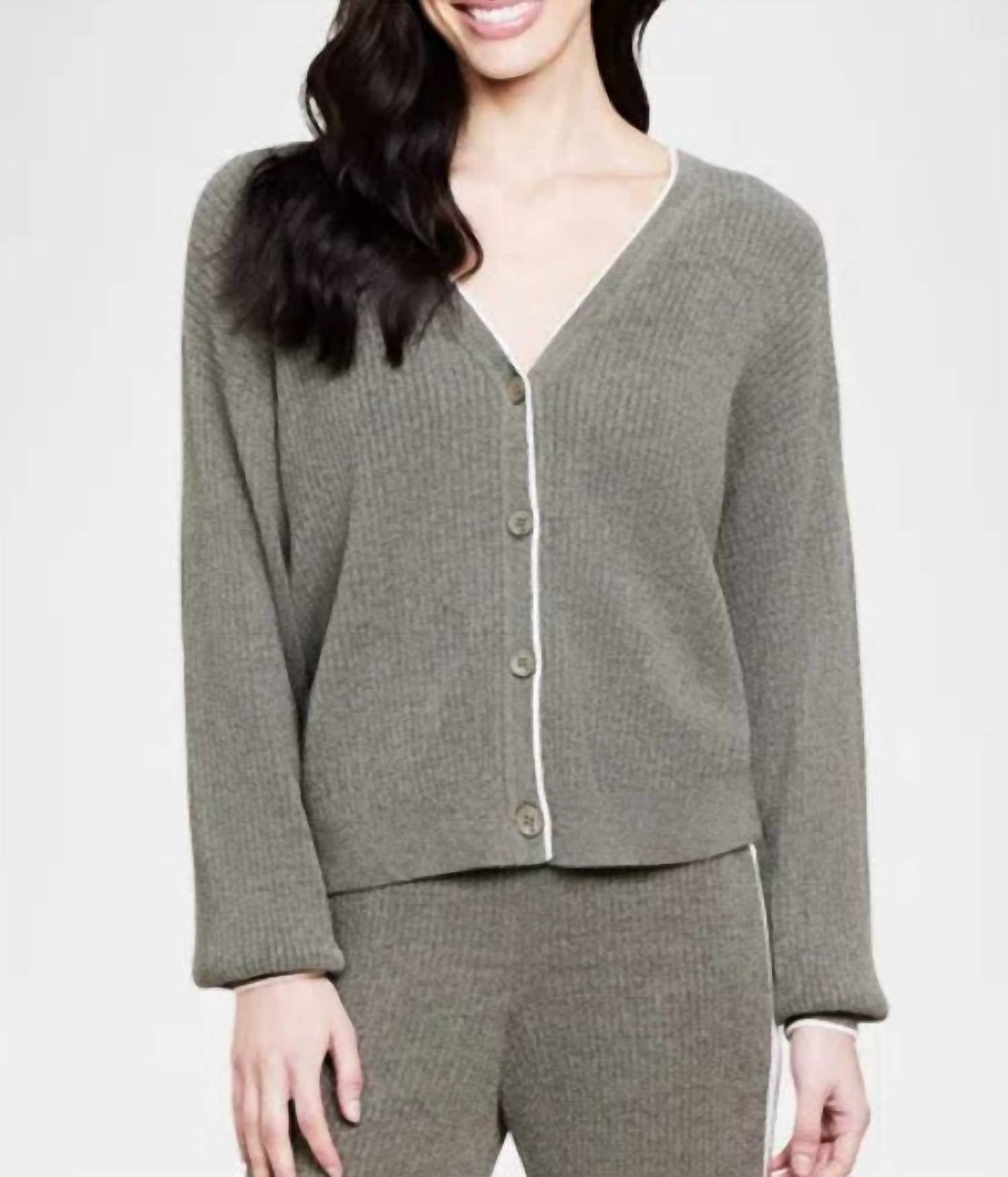 Throw this adorable cardigan over any cami or tank top. Introducing the Contrast Ribbed Cardigan by Barefoot Dreams, a minimalist essential for any fall wardrobe. This women's cardigan features long sleeves in a solid gray hue, crafted from a luxurious nylon blend comprising 71% nylon and 29% viscose. Designed with a pull-on closure and a flattering V-neckline, it's ideal for travel and Thanksgiving gatherings. Care is simple with machine washing and tumble drying recommended.