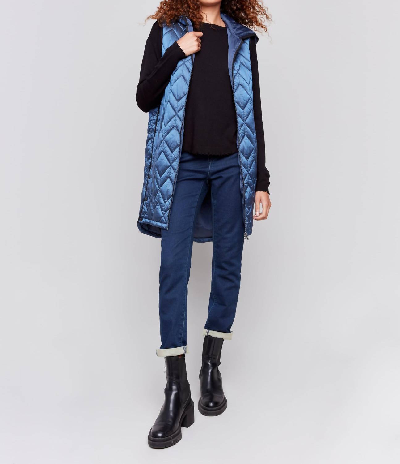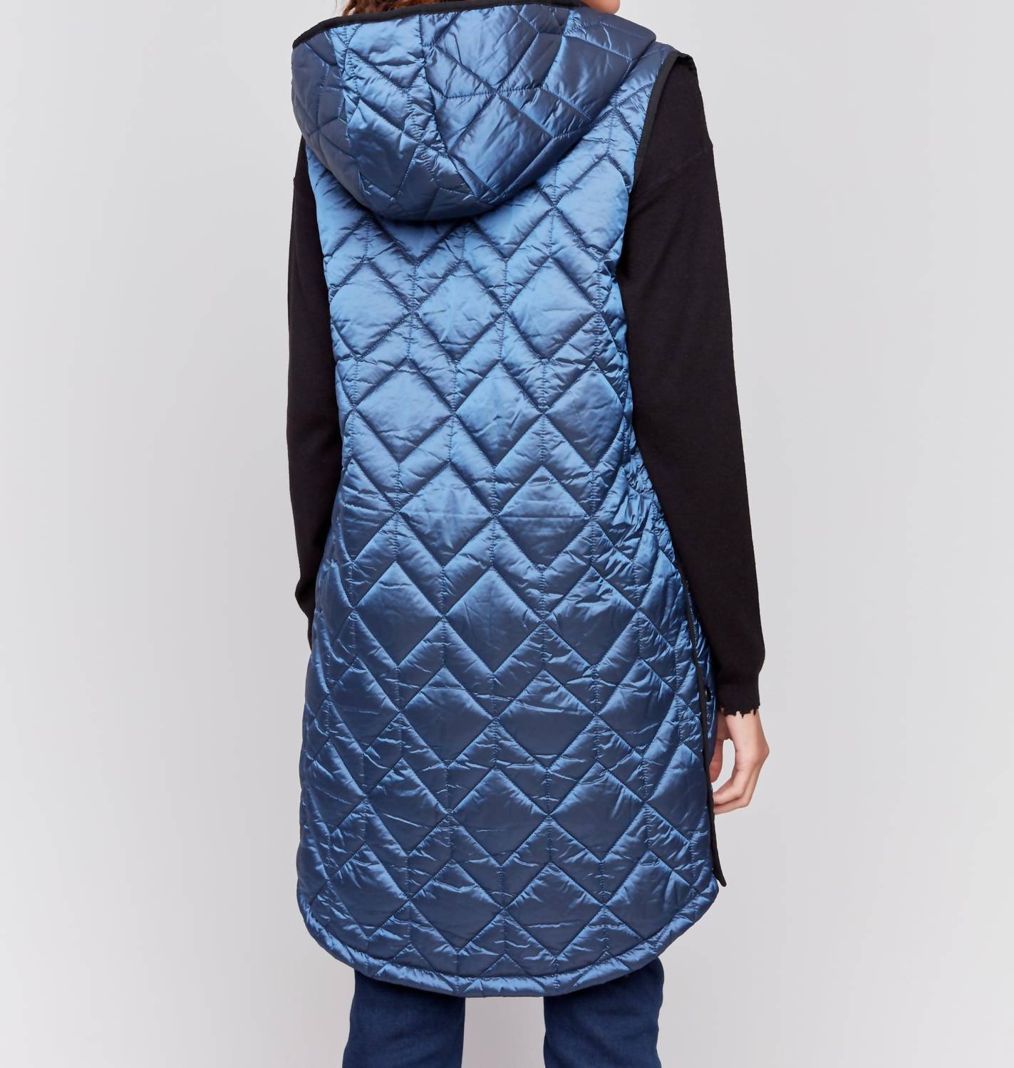 That extra layering piece you didn't know you needed! Introducing the Hooded Quilted Vest by CHARLIE B, crafted for the modern woman in a stylish glacier hue. This sleeveless vest is made entirely of 100% Nylon and features a zip-front closure with a cozy hooded design. Perfect for layering, the geometric quilted pattern adds a chic touch, while side snap button closures and two front pockets enhance functionality. Care instructions include machine washing in cold water and tumble drying on low heat, making it a practical choice for daily wear.