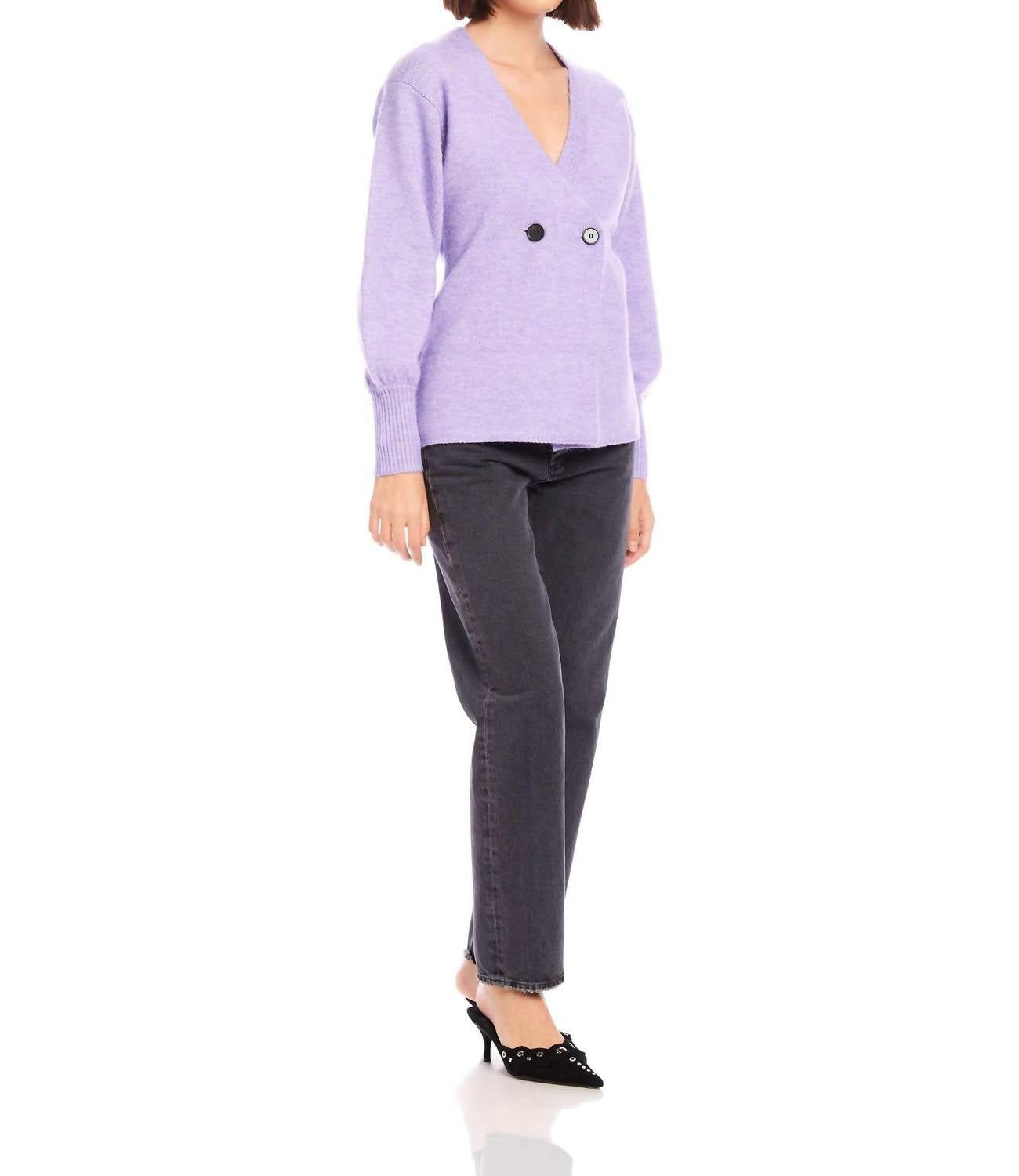 Unveiling the Lucy Cardigan by Fifteen Twenty in a soft lilac hue, a chic choice for cooler days. This women's cardigan features long blouson sleeves and a V-neck for a stylish, refined look. Composition: 48% Recycled Polyester, 30% Polyester, 13% Acrylic, 6% Wool, 3% Spandex. Closure: Double breast button closure.