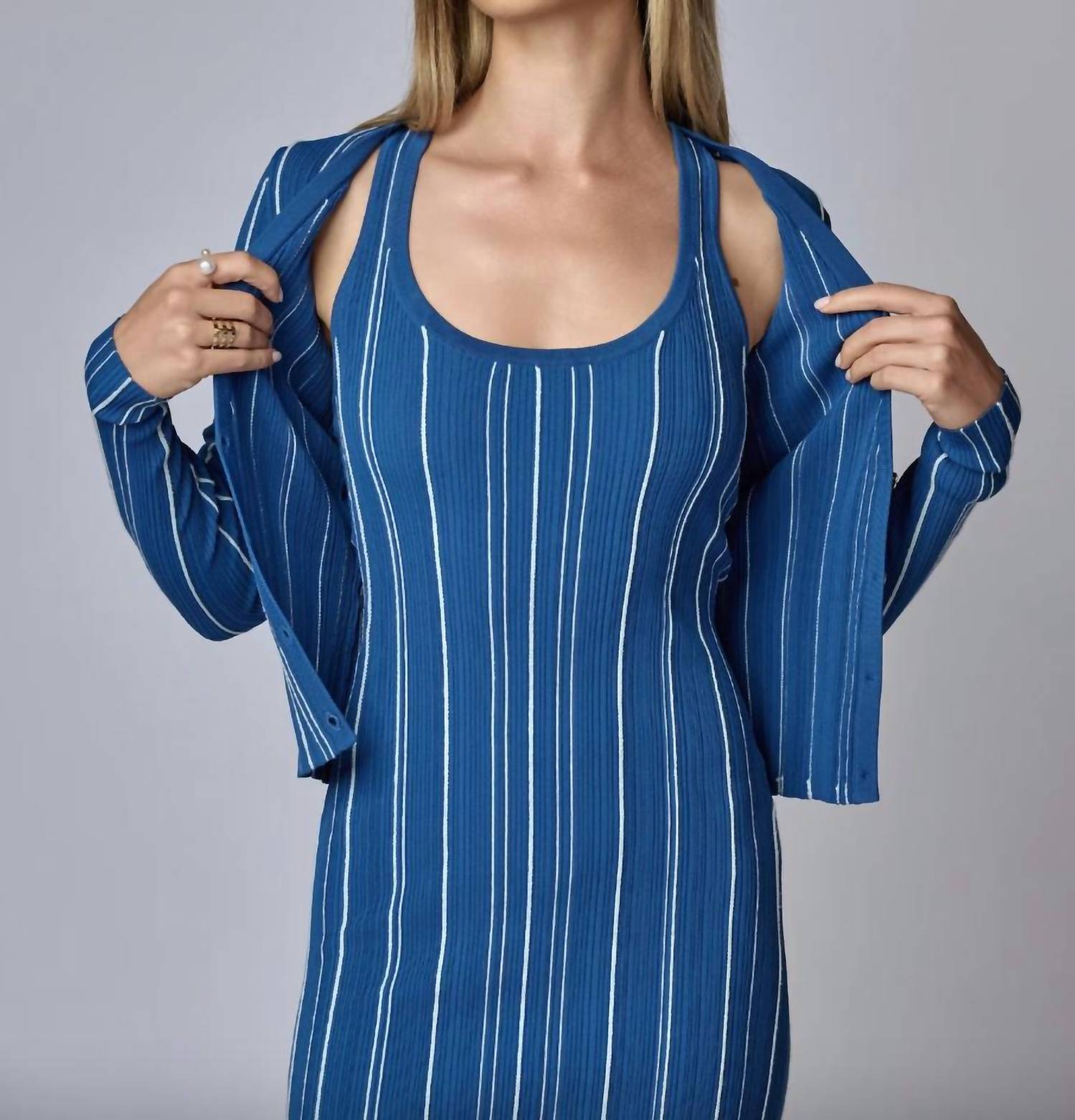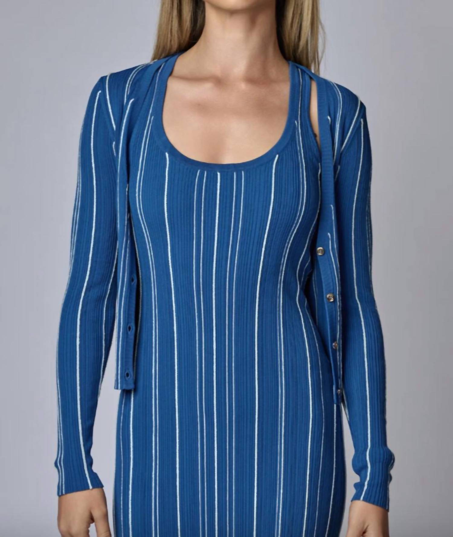 This cardigan will be a sweater-rotation favorite. Introducing the Pearl Long Sleeve Cardigan by Hevron, a chic addition to your wardrobe. This cardigan, in a striking Sapphire Stripe, features a deep V-neckline and long sleeves, exuding elegance. Composed of 72% Viscose, 27% Nylon, and 1% Spandex, it is crafted from a soft viscose knit with a cotton crochet accent. Closure: Metallic button closure. Care: Hand wash and lay flat to dry.