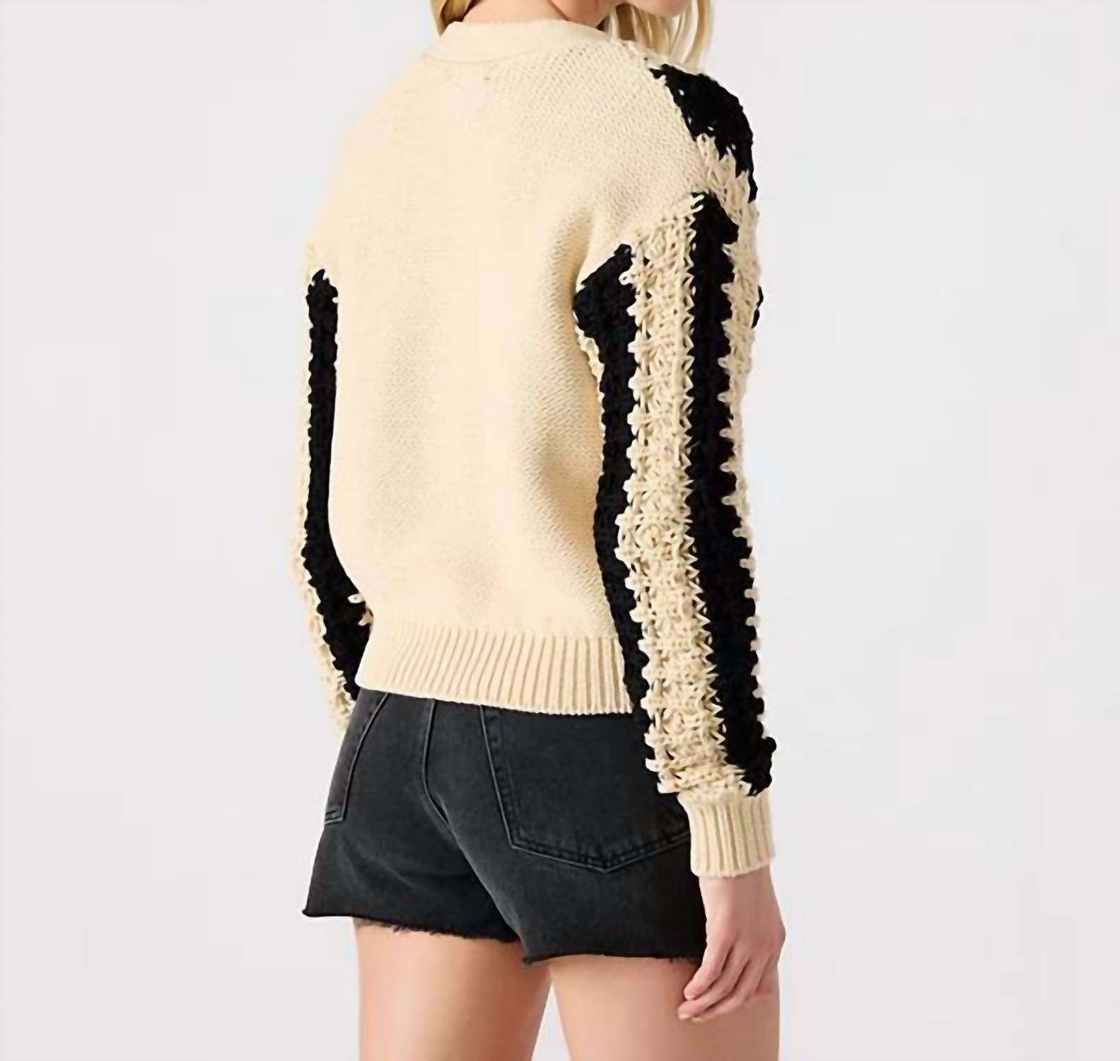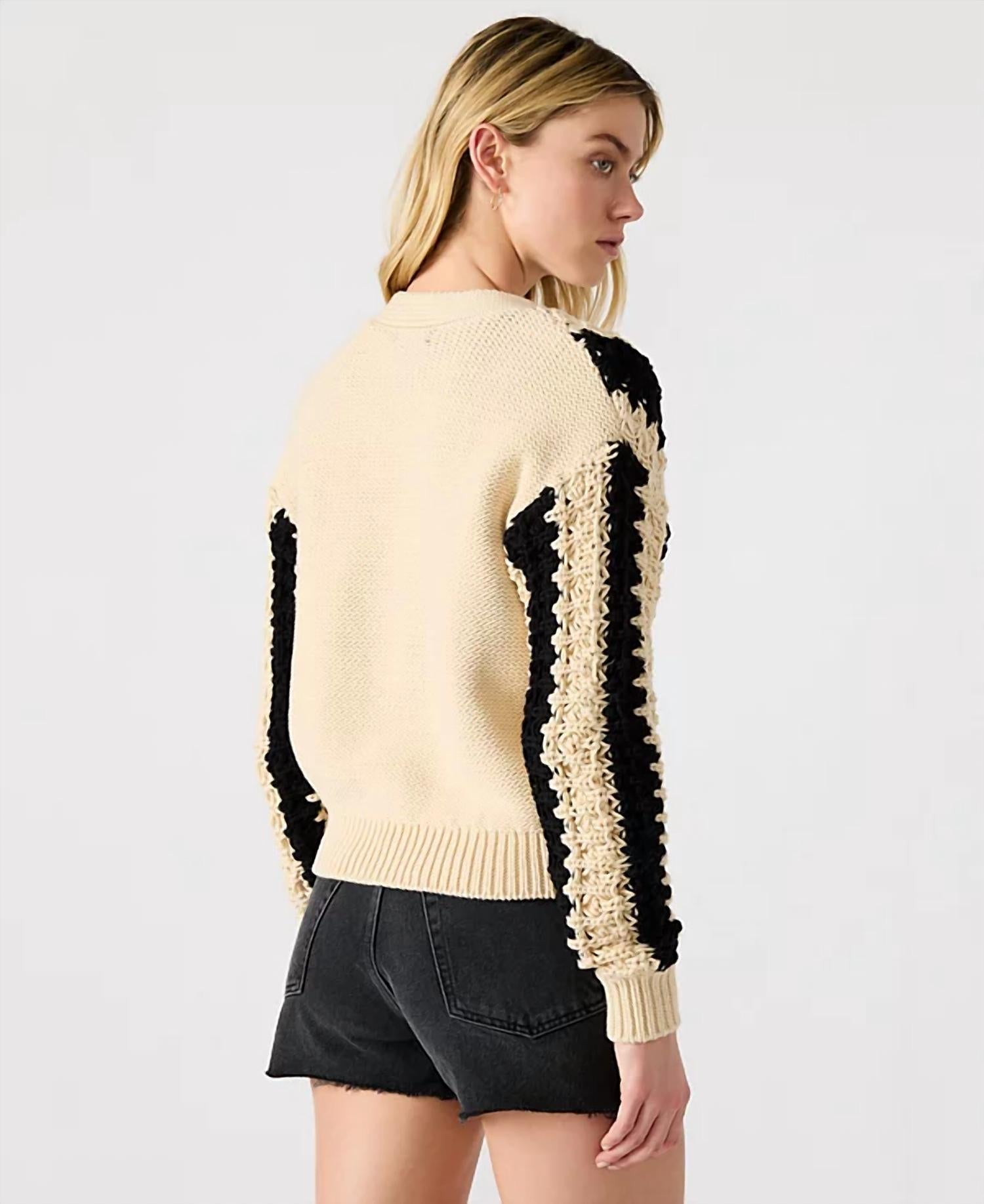 Introducing the Lucas Striped Knit Button-front Cardigan by Steve Madden, a standout piece in Black Multi for women. This long sleeve cardigan showcases contrasting two-toned stripes, adding a graphic touch to the button-front design. Material: Acrylic. Closure: Button closure. Care: Hand wash. Perfect for spring and back-to-school occasions, this cardigan captures a touch of 90s fashion with its V-neck and stripe pattern.