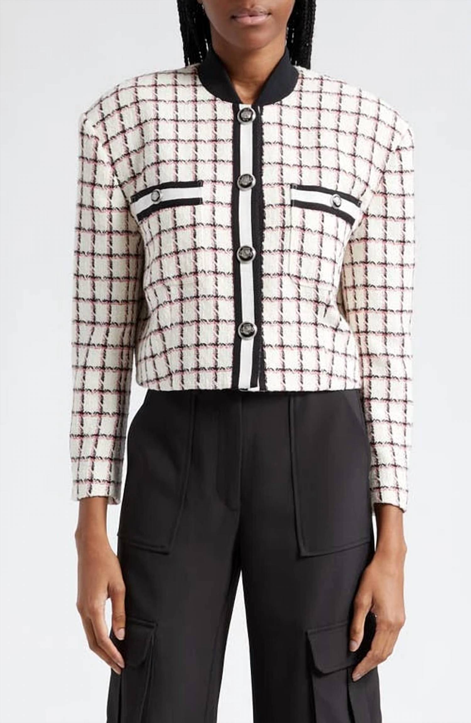 An elevated version of your favorite classic blazer. The Ellicot Jacket by Veronica Beard is an epitome of quiet luxury, perfect for evening events. Crafted with a cotton blend, this ecru multi plaid and check blazer features a sophisticated mockneck and functional pockets. Designed with long sleeves and a button closure, it's ideal for summer occasions, including Thanksgiving. With a focus on style, the jacket is unlined and easy to pair with a variety of outfits.