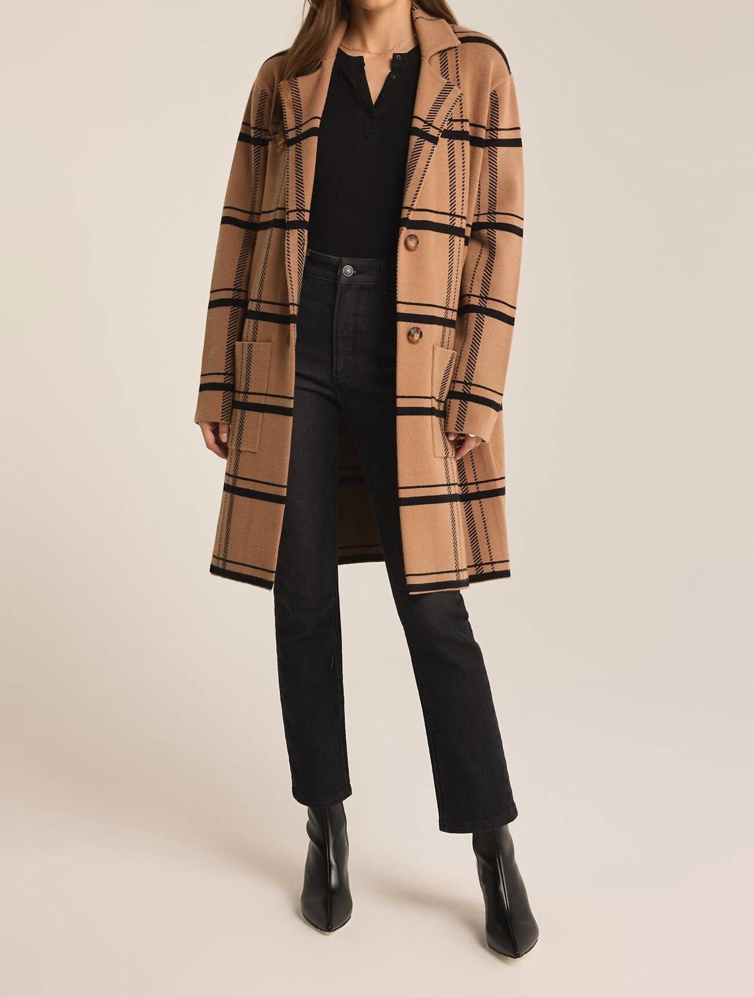 A classic fit that works just as good buttoned as it does left open. Chic classic camel plaid pattern. Featuring long sleeves and a collared neckline. Knee-length cardigan offers both style and comfort. Includes practical patch pockets and a button closure. Perfect for women's wear and suitable.
