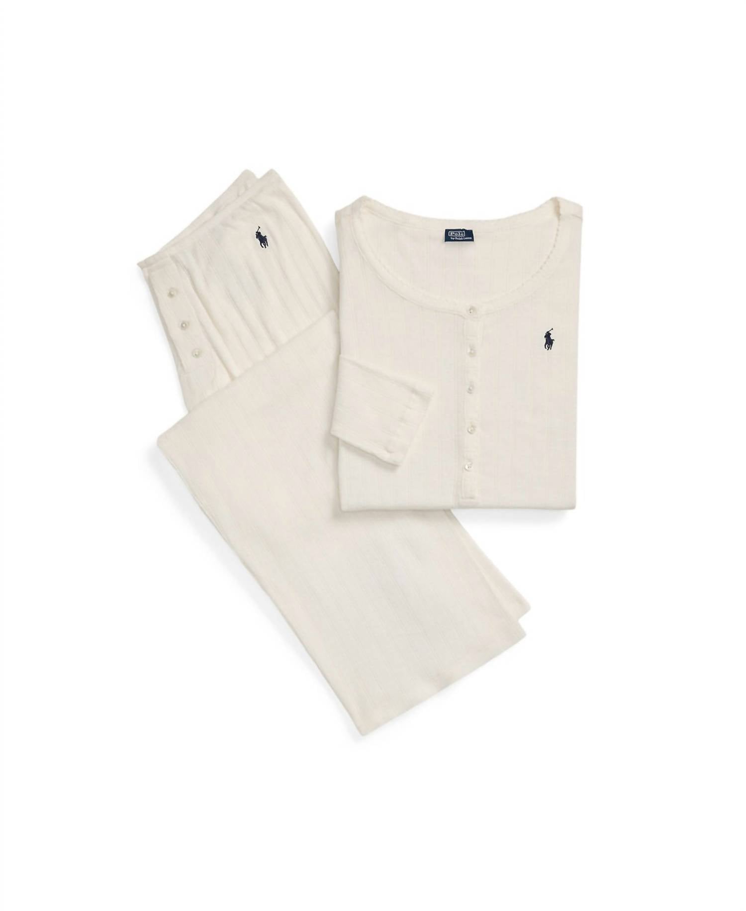 Indulge in comfort with the Polo Pointelle Henley Pajamas by Polo Ralph Lauren, designed in a charming floral print and sophisticated egret color. This set features long sleeves for warmth, made from 100% lightweight cotton, ensuring utmost coziness. The henley top highlights a scoop neckline and button-front closure, while the pants boast an elasticized waistband with a button fly for a relaxed fit. Made for easy care, this pajama set is machine washable for your convenience.