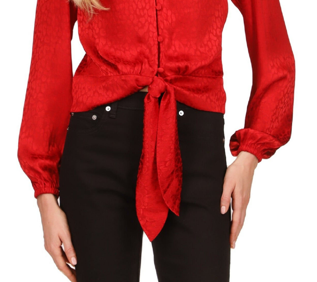 Understated in a tonal animal print| this Michael Kors top features shirred shoulders for stylish drape finished with a tie at the hem|