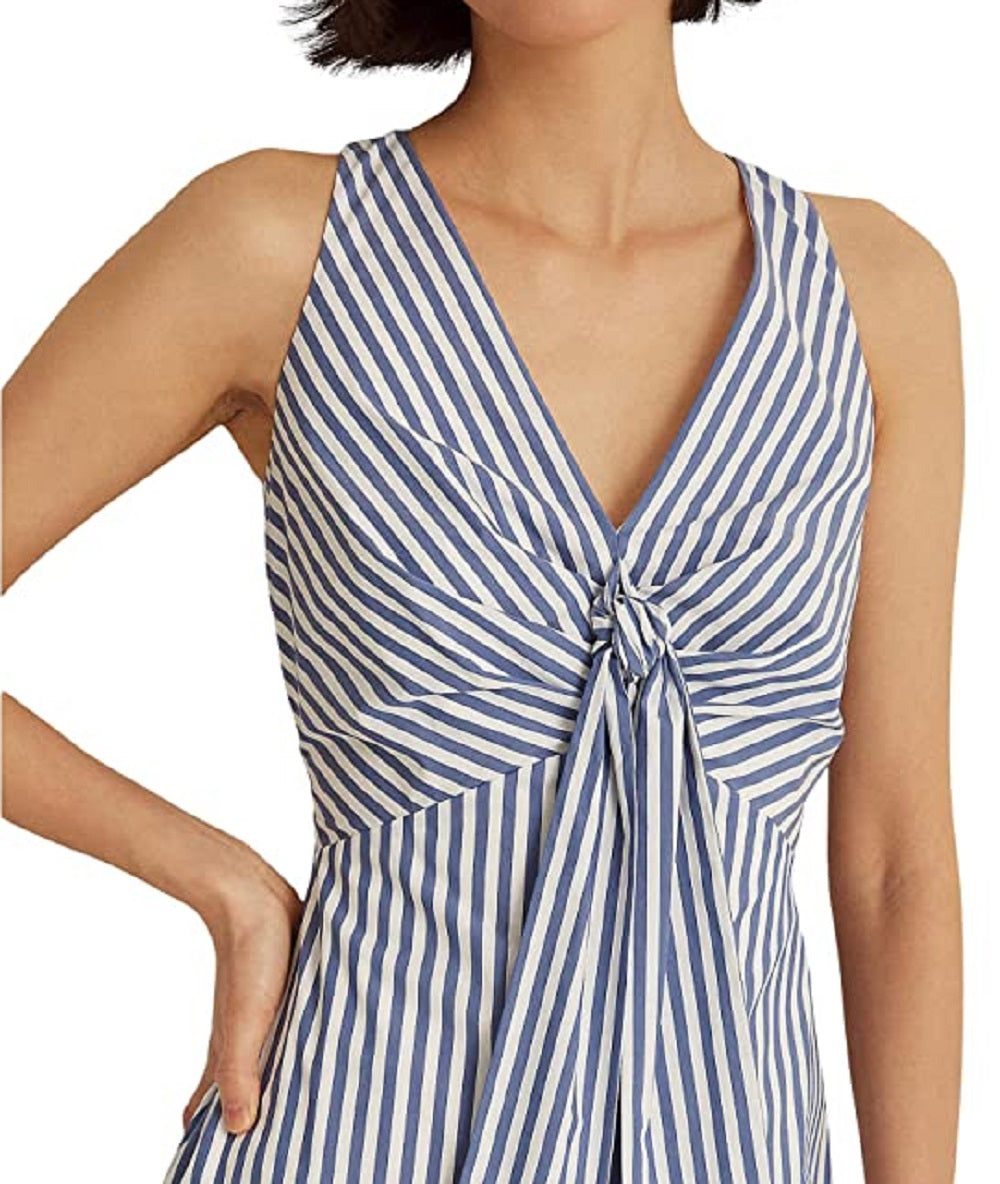 Graceful and feminine| the Ralph Lauren Striped Front Tie Crepe Dress is an instant heart-stealer| Mermaid silhouette| V-neckline and sleeveless| Tie knot on the bodice| Ruffled skirt| Zippered closure