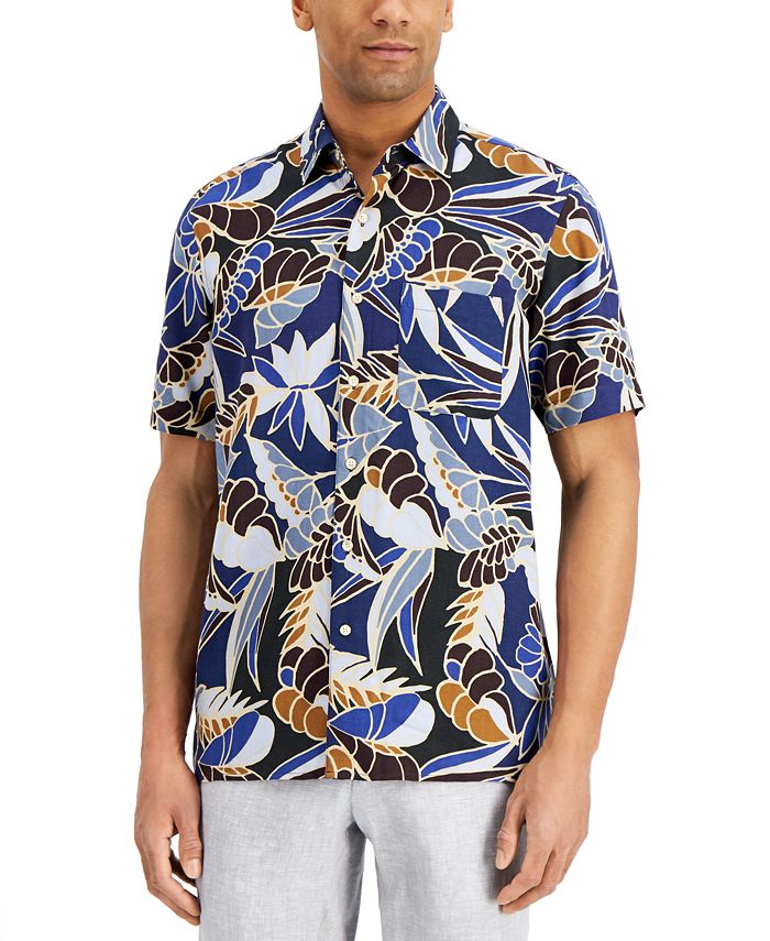 Bring new life to your button-downs with the bold floral-print pattern styling this comfortable shirt from Tasso Elba. | Spread collar| Leaf-print pattern; patch pocket at left chest | | Silk/rayon| Machine washable| Imported