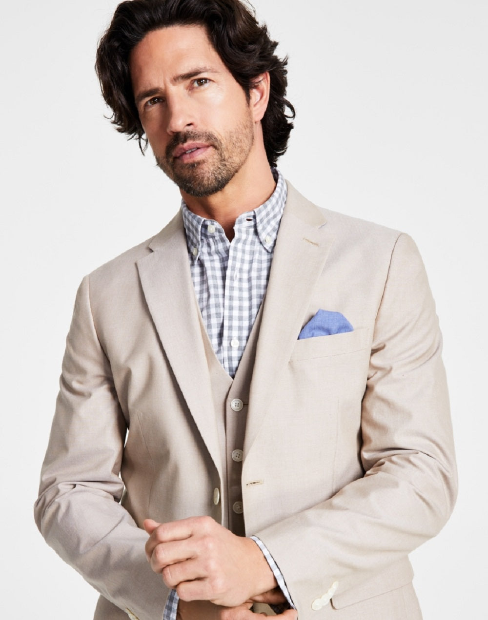 Soft and lightweight| the chambray fabric of this tailored Tommy Hilfiger suit separate jacket is enhanced by its Th Flex design which provides a comfortable degree of stretch| All this combined allows for a suit jacket that can ensure comfort| ease of wear and movability all the day through| This versatile suit jacket can be paired with a number of options for a formal ensemble to meet the need of many an occasion| Alternatively| you can pair this jacket with the matching vest and pants for a l