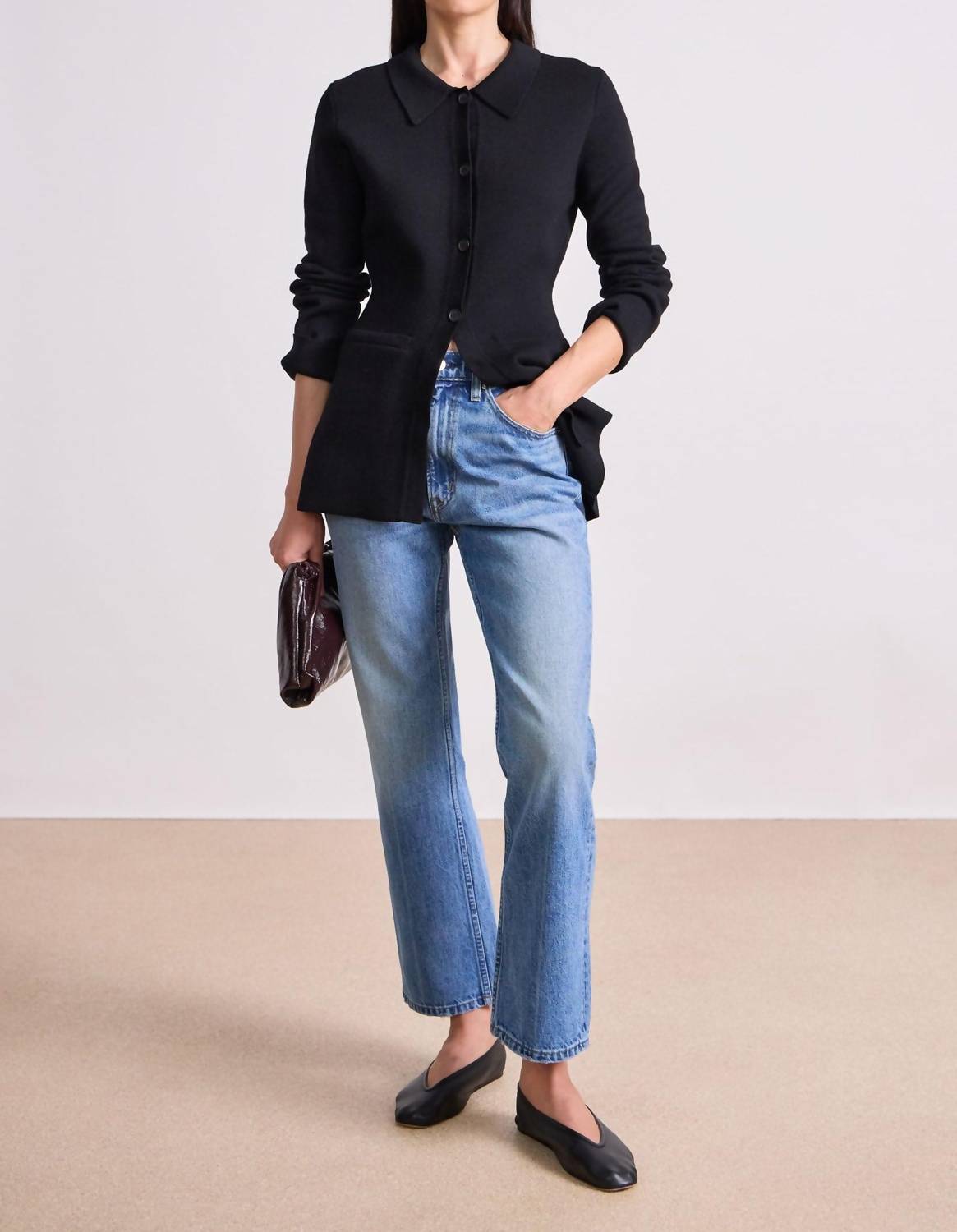 A classic fit that works just as good buttoned as it does left open. Elevate your fall wardrobe with the black Betti Knit Cardigan by APIECE APART, perfect for Thanksgiving gatherings and holiday parties. This minimalist piece features long sleeves and is meticulously crafted from 100% merino wool, ensuring optimal comfort and softness. Originating from China, it offers a polished look with a polo collar and center front button closure, accentuated by convenient front pocket details. For maintenance, the cardigan is designed for dry clean only to preserve its pristine condition.