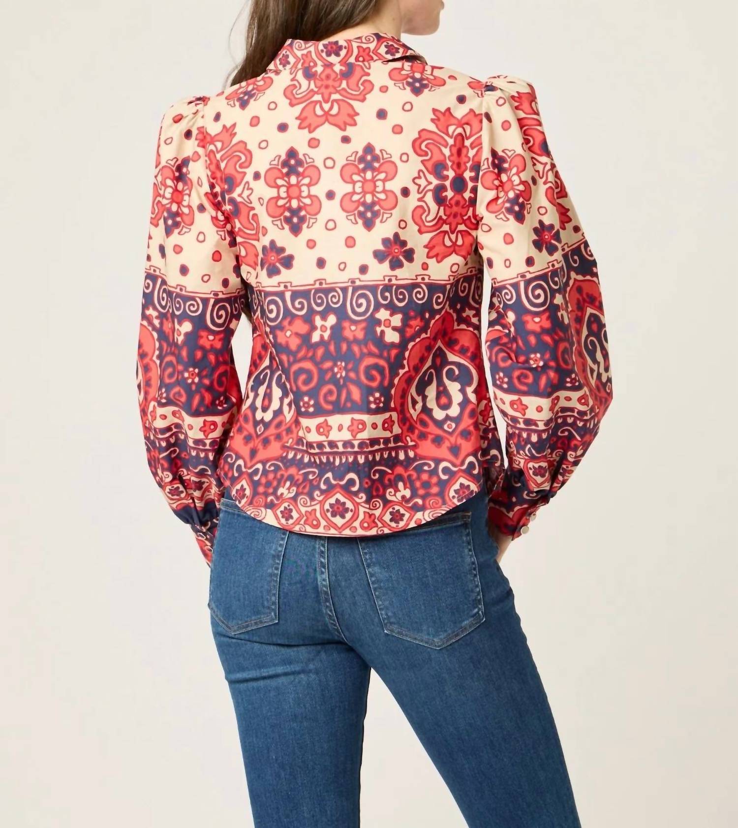 Introducing the Printed Llana Top by BTB Los Angeles, a captivating addition to your summer wardrobe. This luxurious blouse in bold red boasts voluminous long sleeves that elegantly taper into structured, fitted cuffs, adding a touch of drama to your silhouette. Crafted from 100% printed cotton poplin and expertly made in China, it features a center front button placket for easy wear. To maintain its vibrant appearance, this piece is recommended for dry cleaning only.
