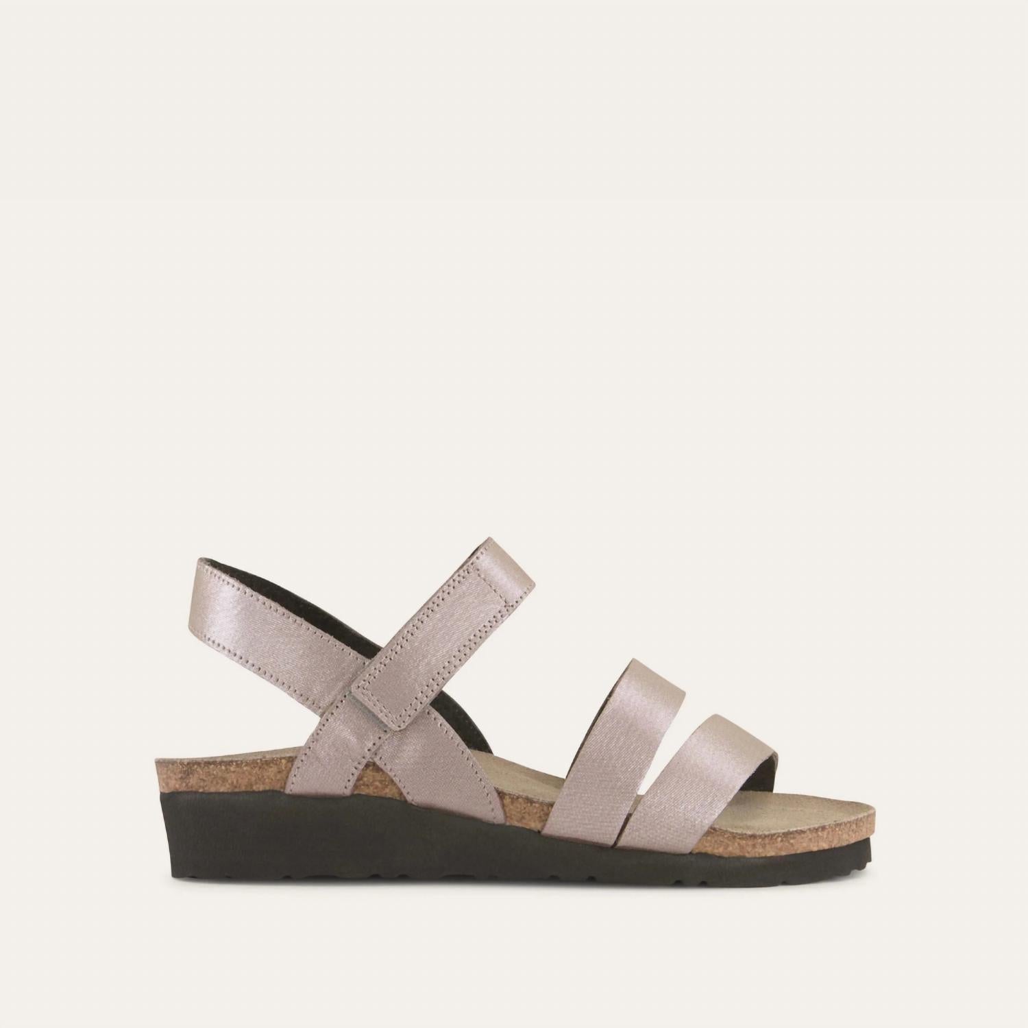Experience unbeatable comfort and style with the Women's Kayla Sandal by NAOT, crafted in Silver Threads Leather. The sandal features an open toe and a wedge heel with a height of 1.75 inches, perfect for a summer vacation or trendy streetwear look. Made from durable suede, it includes three supportive straps, a hook and loop at the instep, and a backstrap for stability. Enjoy the comfort of Naot's anatomic cork and latex footbed, endorsed by the APMA for promoting good foot health.