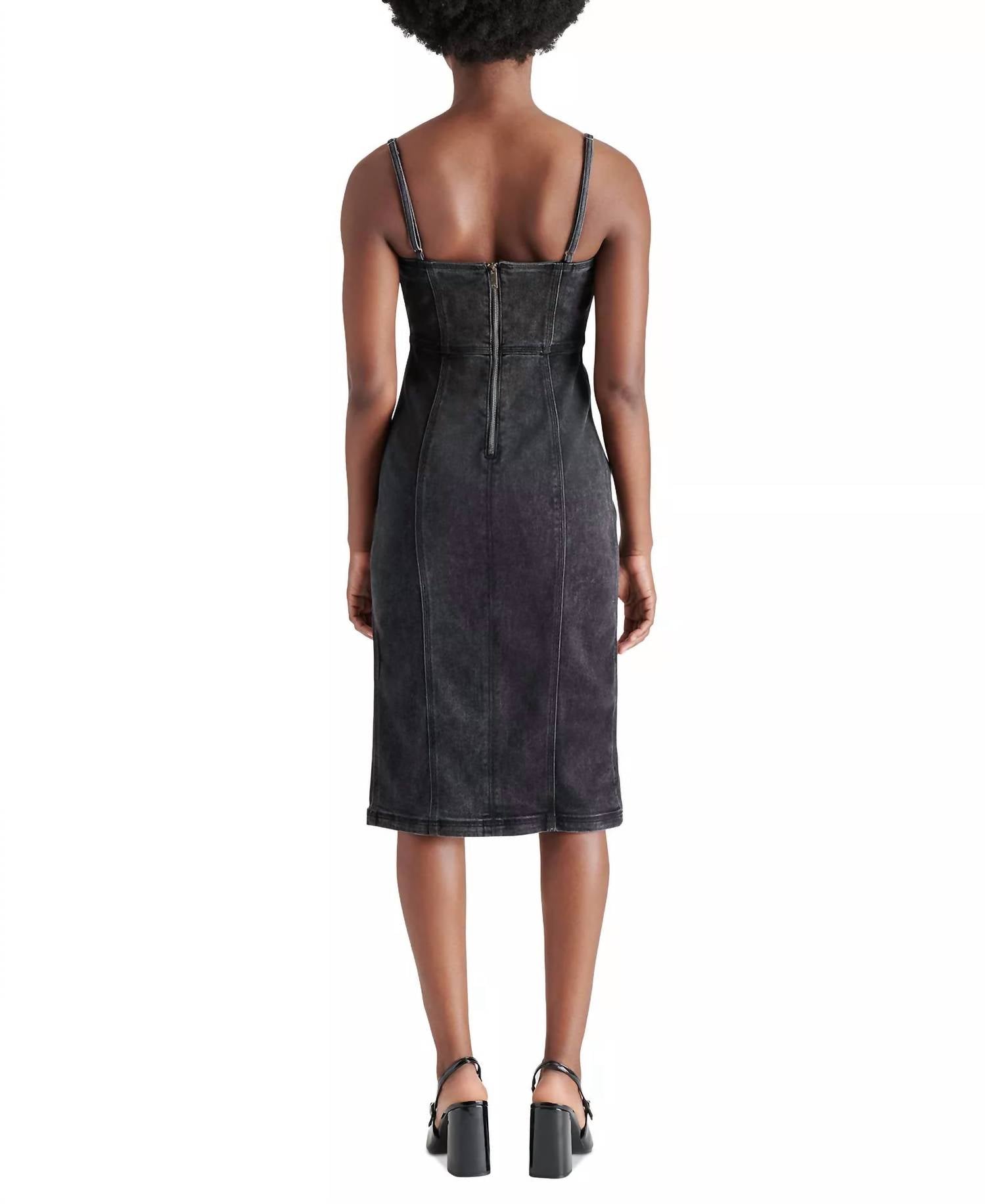 Introducing the Giselle Midi Dress by Steve Madden, a chic ensemble in washed black denim perfect for a summer dinner party or casual outing. This sheath dress features spaghetti straps and a sleek zip closure, allowing for a tailor-made fit. Crafted from a mix of cotton and spandex, it offers comfort and style with a flattering square neckline. Effortless care ensures this minimalist piece maintains its sharp look and confident fit—simply machine wash as needed.