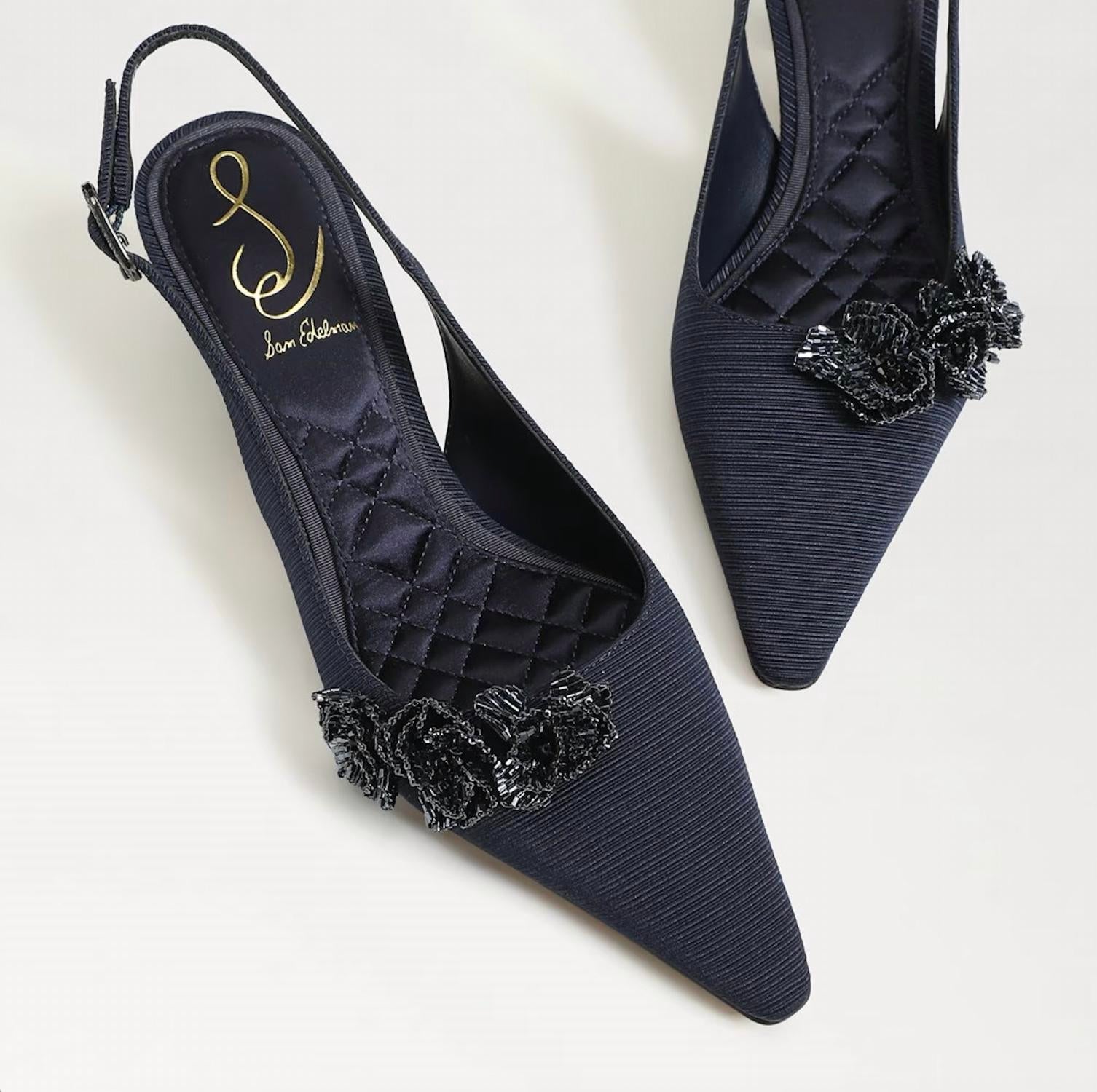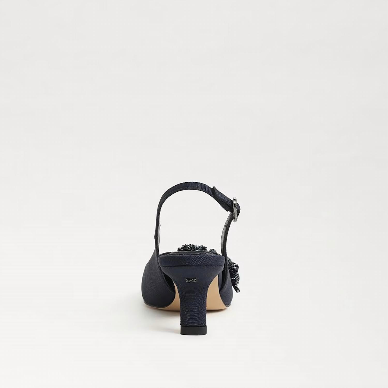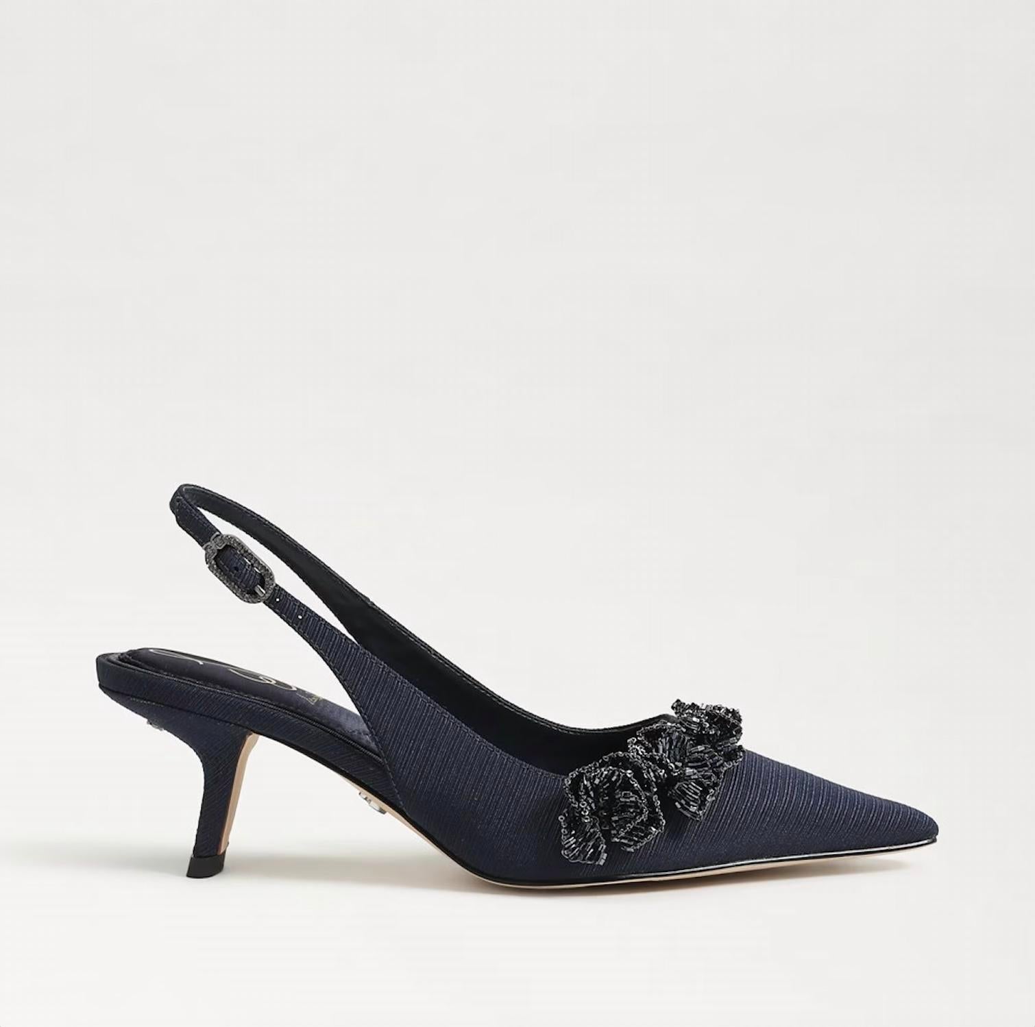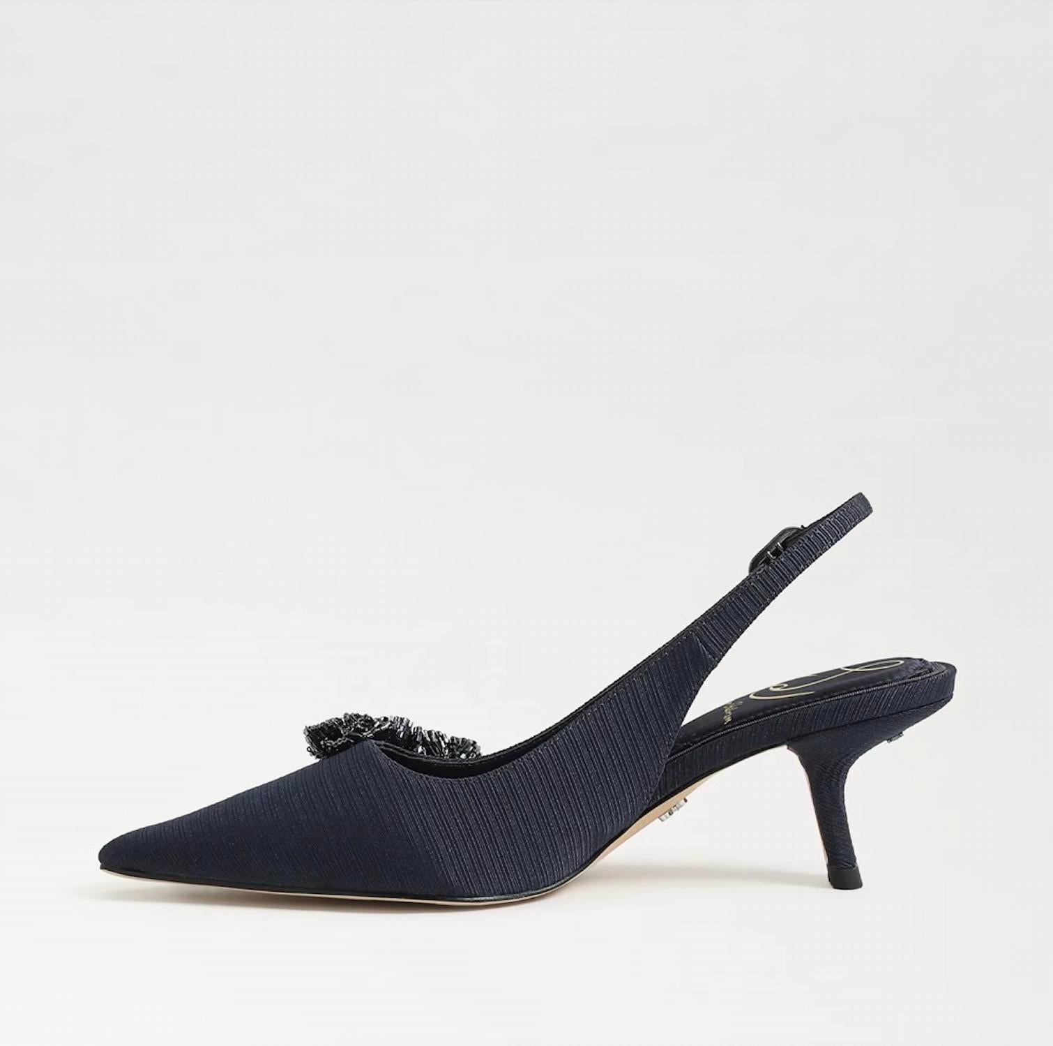 The perfect height for day to night. Step up your style with the Sam Edelman Bianka Fabric Pointed Toe Slingback Kitten Heeled Pump in elegant Midnight Blue. These pumps are crafted with a chic blend of leather and fabric materials, featuring a sophisticated pointy toe and a comfortable 2.4" kitten heel. The stylish slingback design includes a secure buckle closure for an added touch of charm. With synthetic insoles, these heels blend fashion and comfort effortlessly, making them the perfect choice for your next holiday party.